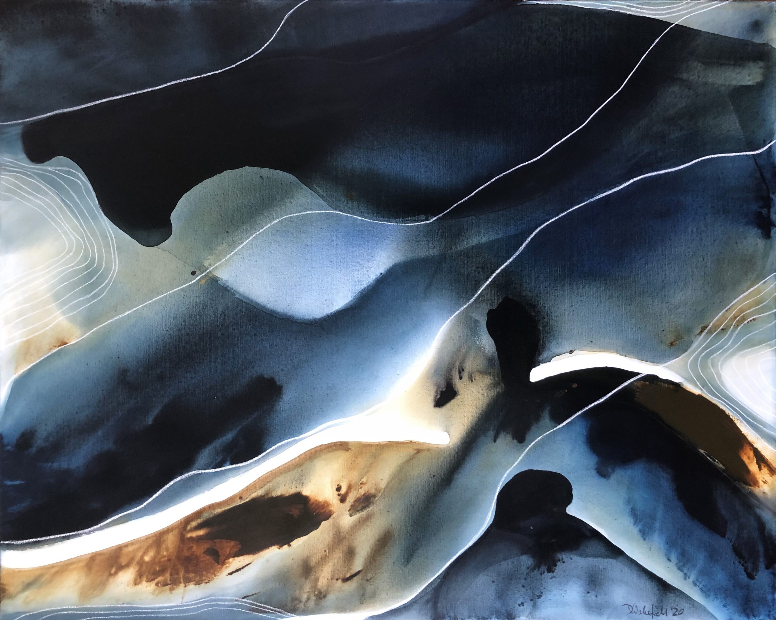 When Midnight Disappears by Dinah Wakefeild is inspired by the light, the colours and the natural beauty of the Noosa region of Australia. “What I love most about Noosa is the interplay of light. From the oceans to the clouds, to the river estuaries and the hinterland, this canvas unfolds before me every day and finds expression in my paintings”.