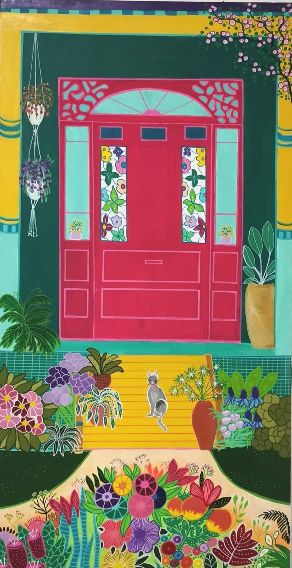 I saw these colours on a house a while back and was draw of course to the colours. I was painting more houses at the time and saw this as another idea. I added the cat a few weeks after completion of this artwork, it was just begging to be there!