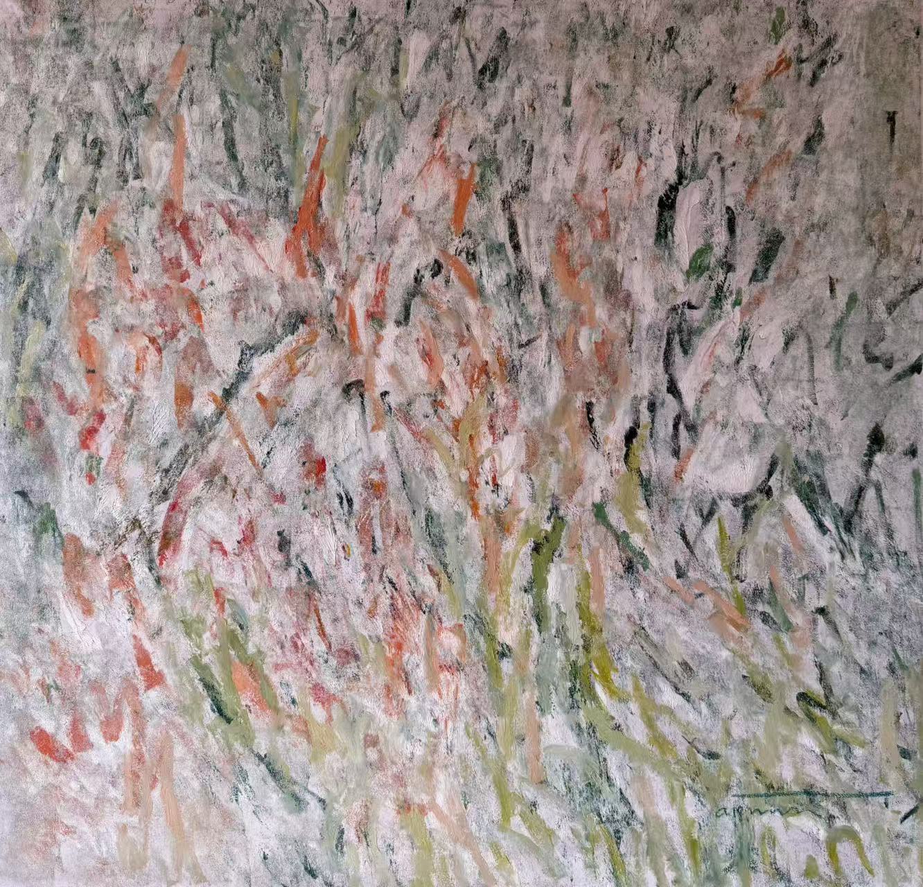 The painting unfolds on a soft ground of warm ivory and muted apricot, where hints of blue-green and pale gold emerge and dissolve, like light brushing through grass carried by the wind. The layered brushstrokes do not insist on form; instead, they move, overlap, and breathe. Light here does not shine outward—it lingers quietly within the movement of air, gentle and constant.