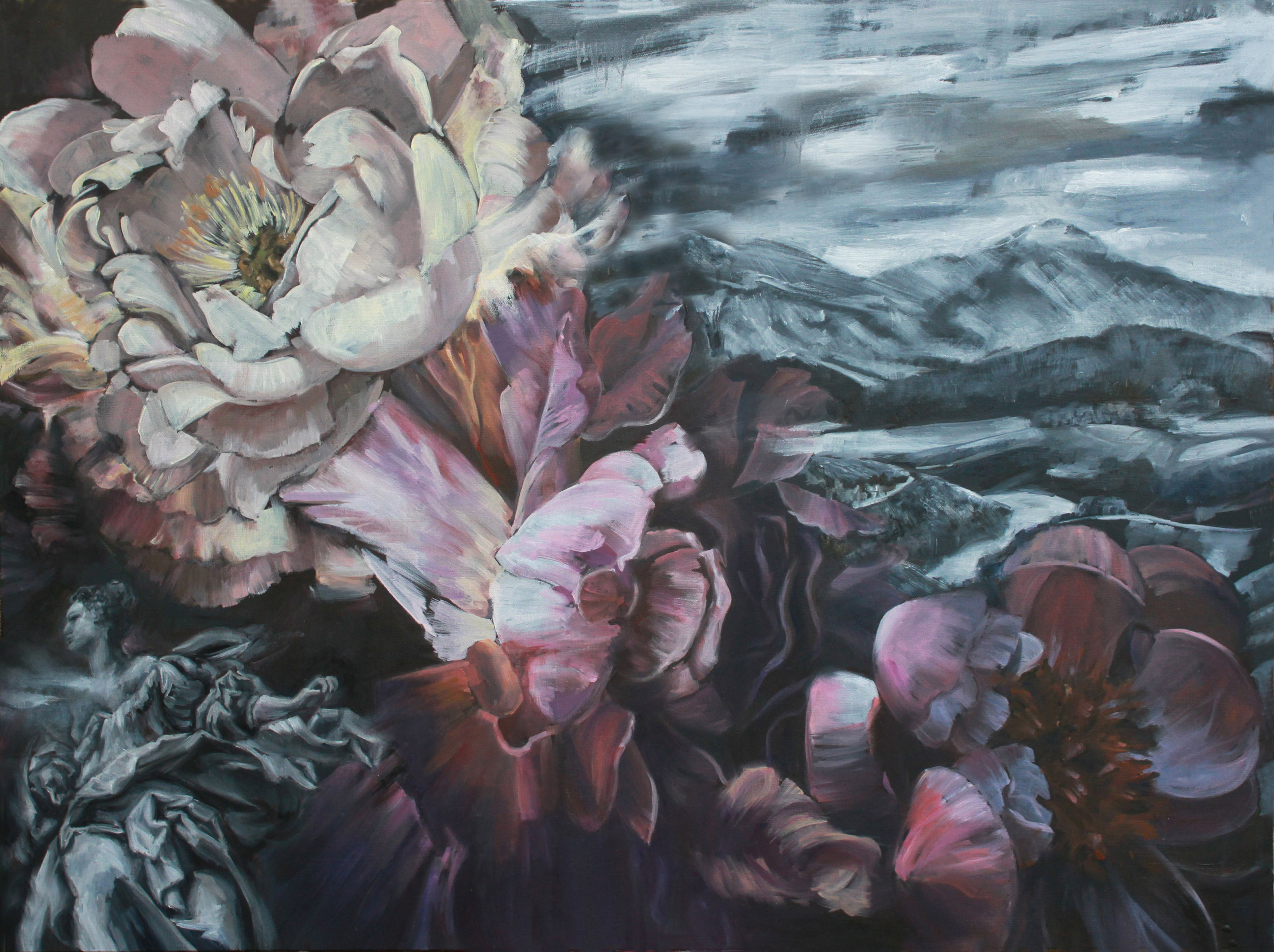 The peony a representation of love, romance and loyalty – the delicate fleshy petals softening, taming the harsh landscape it now inhabits.