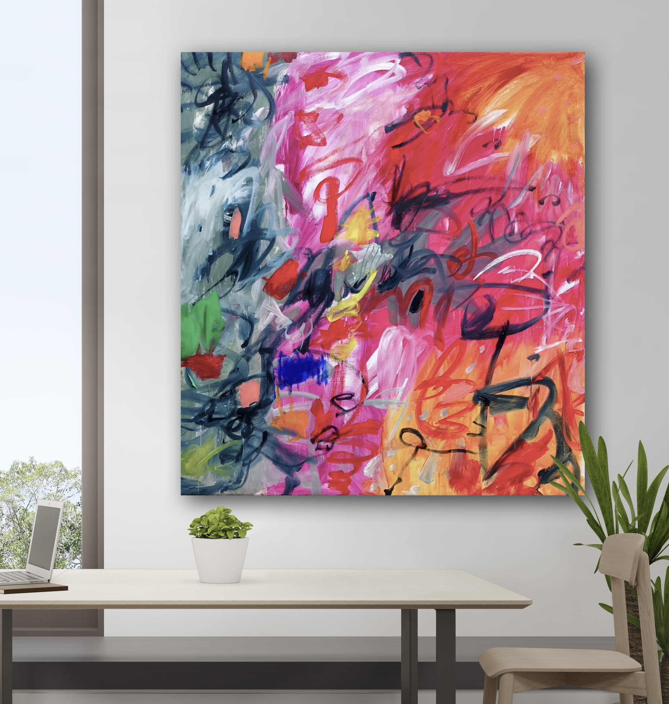 This work is acrylic on 105cm X115cm on Fine Belgian Linen, signed on the front and sent with an artist cv and certificate of authenticity.