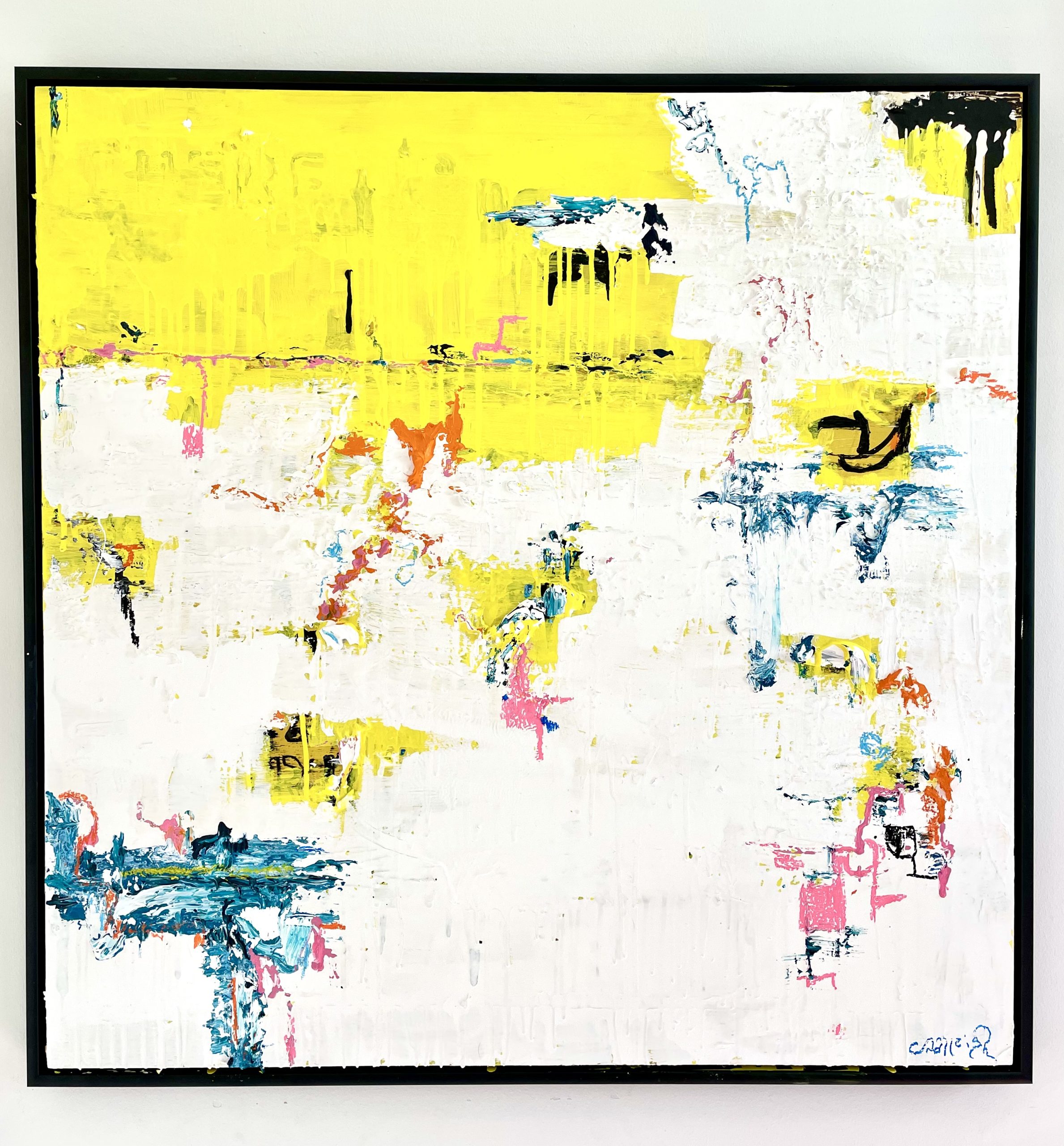 Beautiful contemporary abstract piece – original in black art gallery quality frame. Yellow and white shiny oil and thick, textural acrylic make this landscape abstract work tells stories within itself.