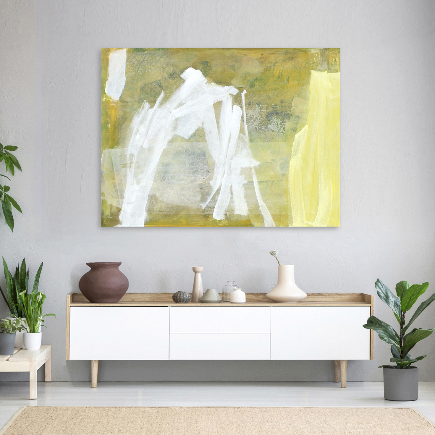 Where are you Going is a combination of green ochre and mustard, lemon yellow and dark green with white brushwork. She’s painted on a quality stretched canvas. The image wraps around the 3.8cm sides so Where are you Going  is ready to hang.