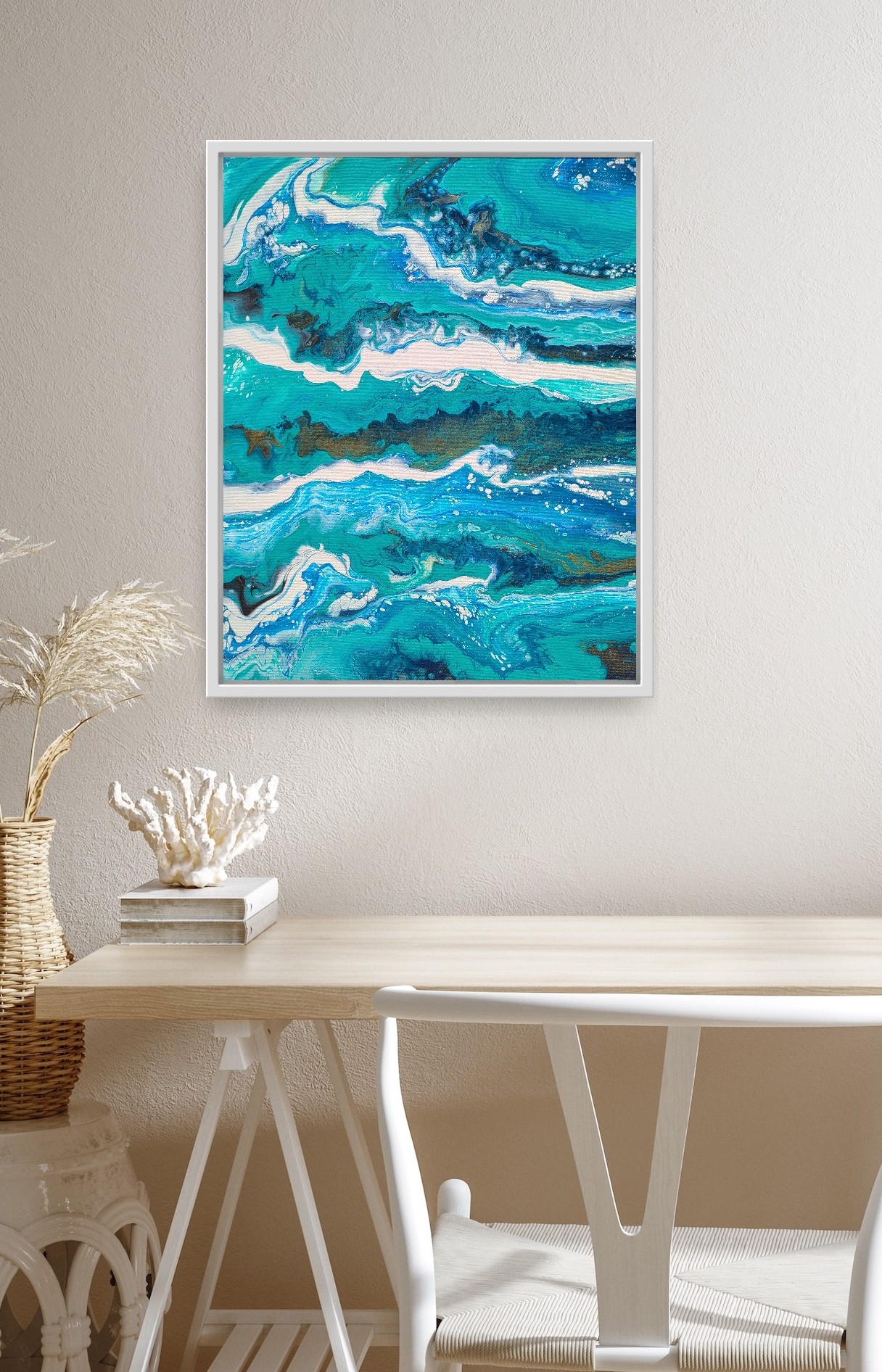 The painting is presented on a thick gallery-wrapped canvas, with the paint elegantly extending over the sides, creating a gallery finish that doesn’t require framing or more cost to you, ensuring a cohesive look from every angle and offering versatility in display options. For your information the majority of people don’t add external framing, however if it is your preference, it is a very easy option prior to checkout.