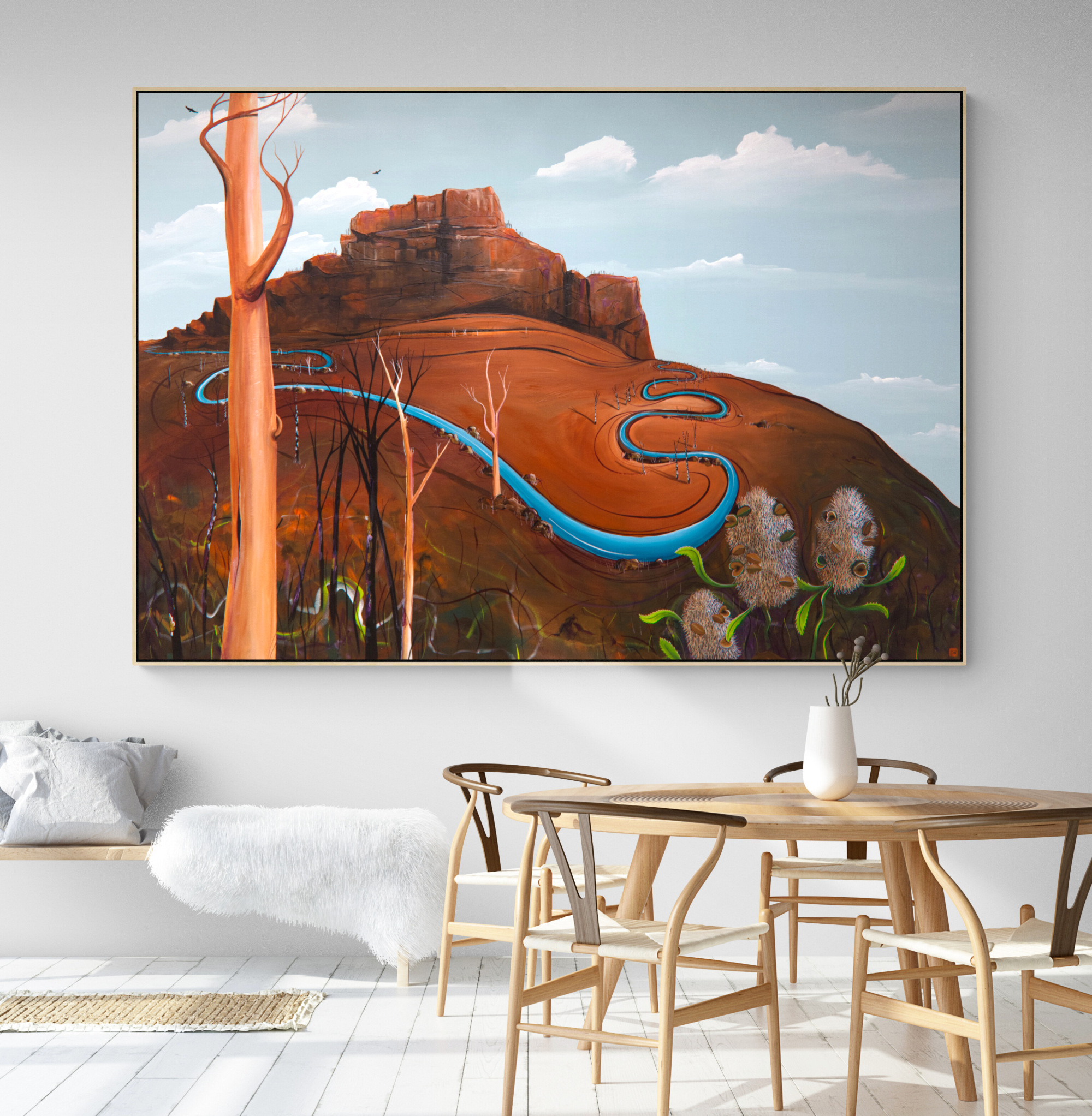 In the bottom right, vibrant Banksias come to life. Their forms are stylised and expressive, adding a burst of emotion to the composition. The Banksias, in bloom and reaching towards the river, create a visual narrative that harmonises with the overall emotional tone of the painting.