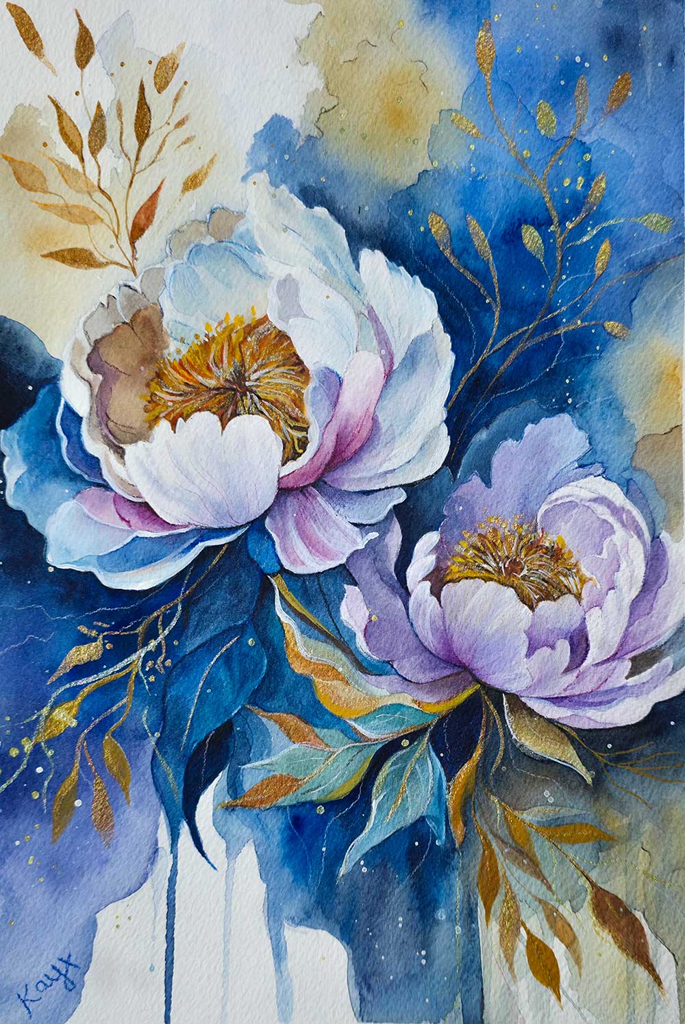 Where Light Lingers by Kay Shanley – soft petals unfurl in hues of violet, indigo, and gold — a quiet celebration of light’s resilience even in the deepest shadows. The interplay of rich blues and shimmering metallics evokes a sense of calm and renewal, capturing that fleeting moment where beauty glows from within.