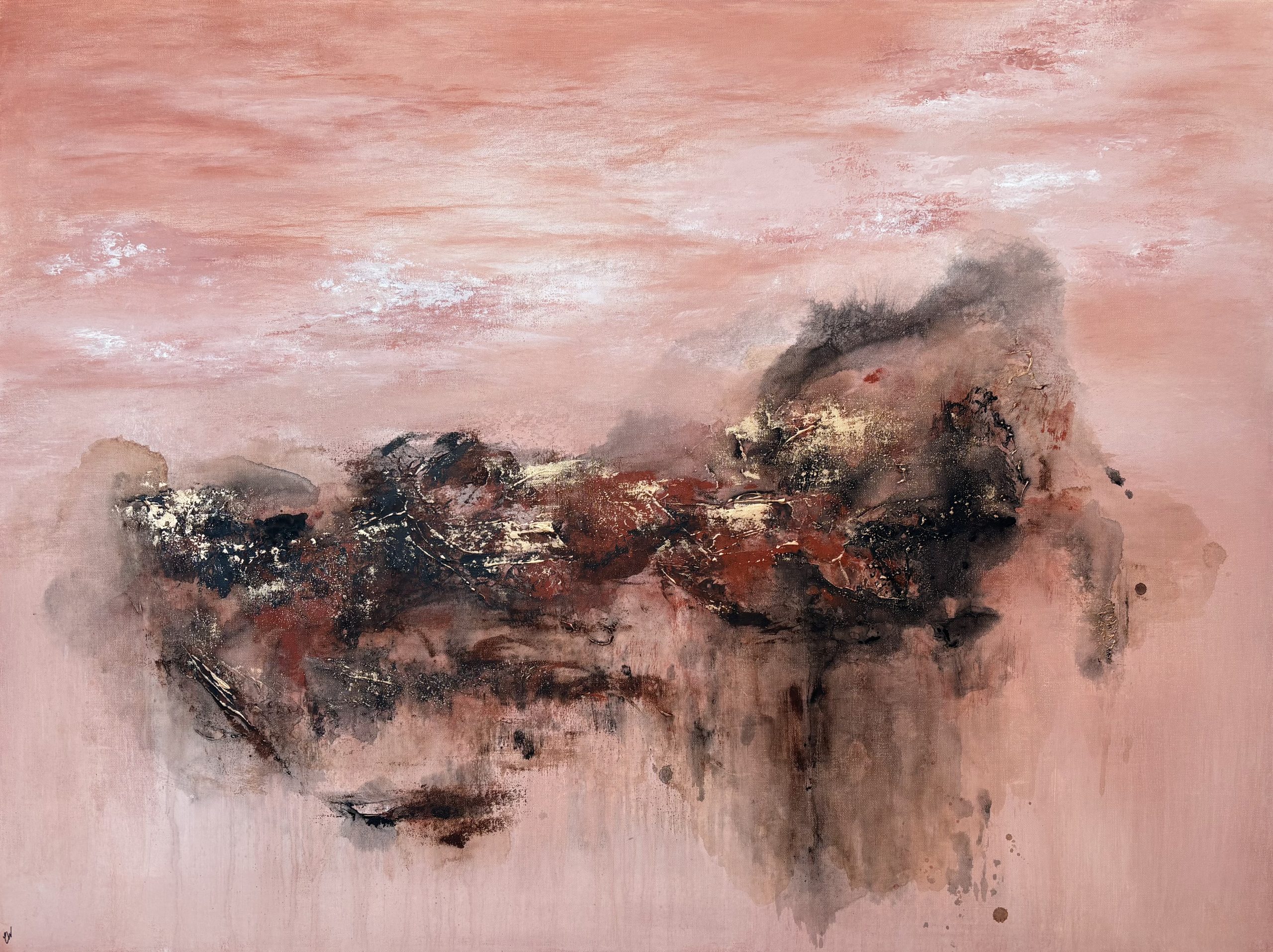 Where Light Lingers by Carrie Welsh is a beautifully textured abstract landscape with shimmering metallic details. 121.8 x 91.4 cm. Acrylic on canvas, ready to hang. Frame not included.