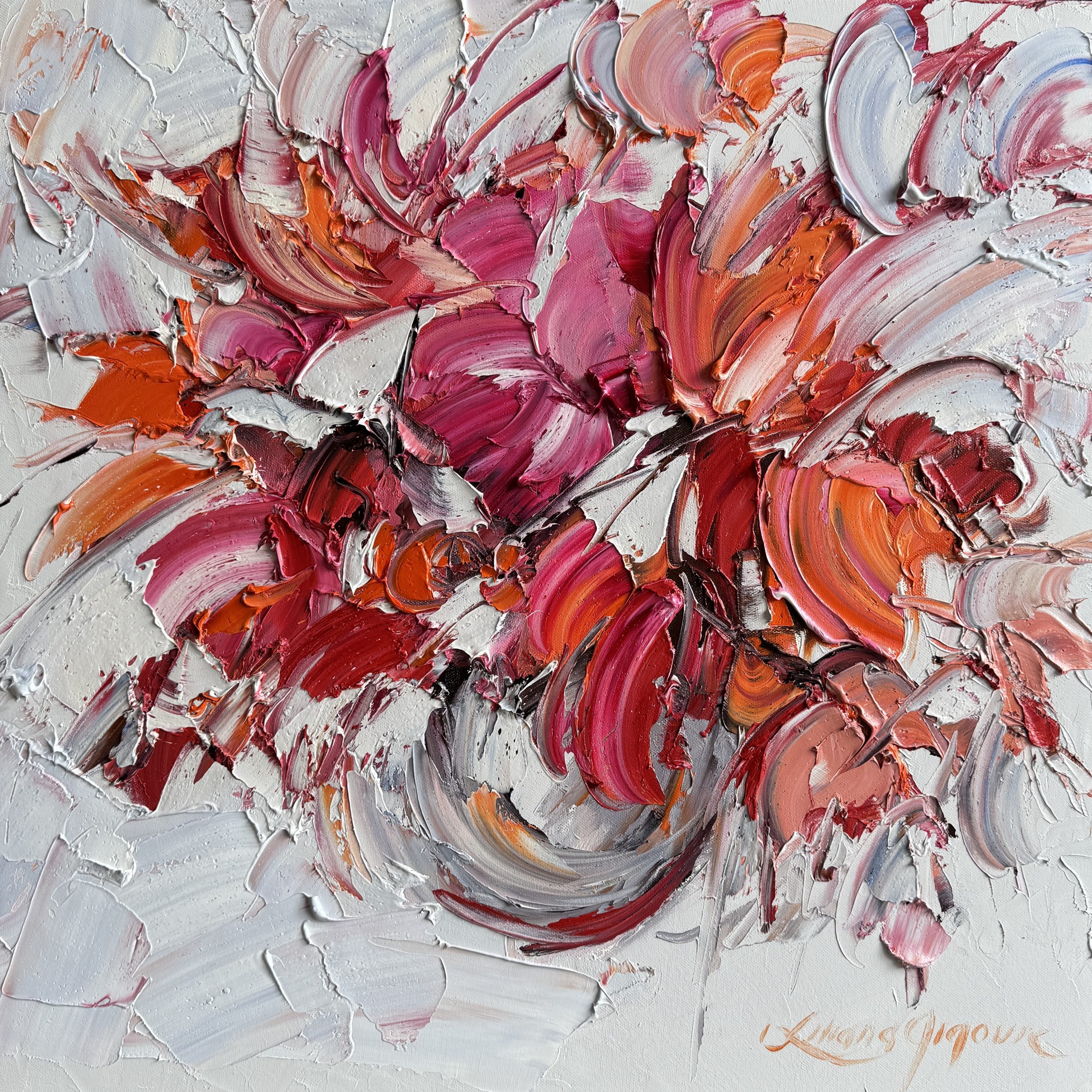 This painting is a vibrant burst of colour and motion. Thick palette-knife strokes in reds, pinks, and oranges swirl together like abstract petals, contrasted by soft whites and greys. It feels dynamic, textured, and full of energy.