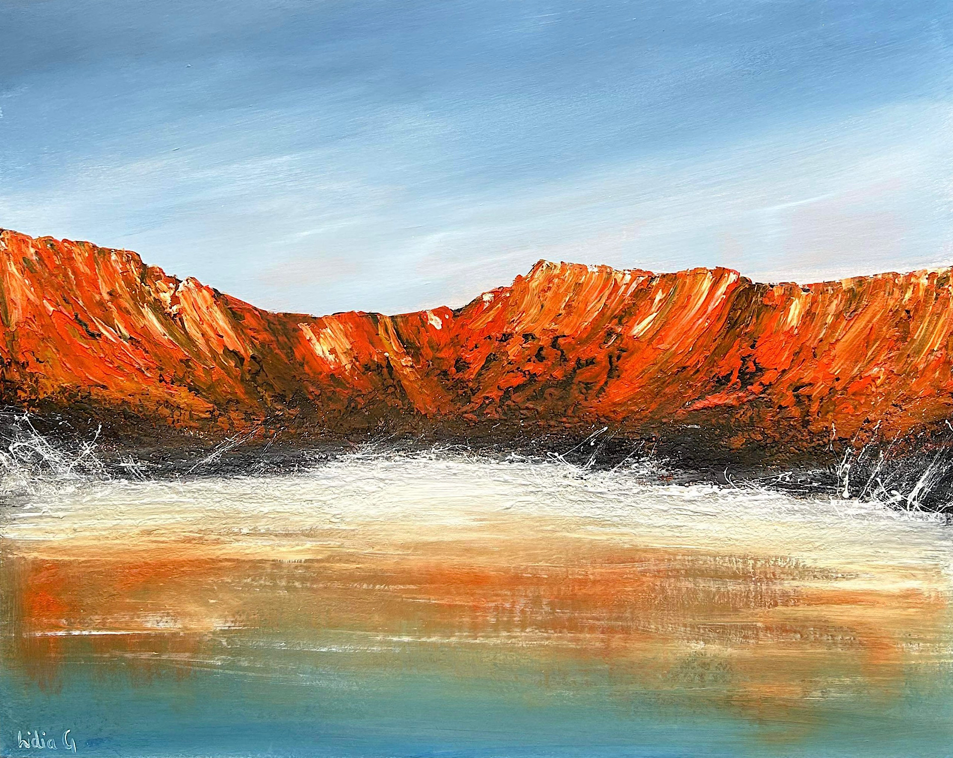 Inspired by the incredible diversity of the Australian landscape from its rugged coastlines, snow-capped mountains and the idiosyncratic landscape of the sandy desert with its sun baked monoliths and rainforests. The edges of the painting are finished in Lamp black and it is heavily textured and also varnished for protection. It also comes with professional wire hanger and a Certificate of Authenticity.