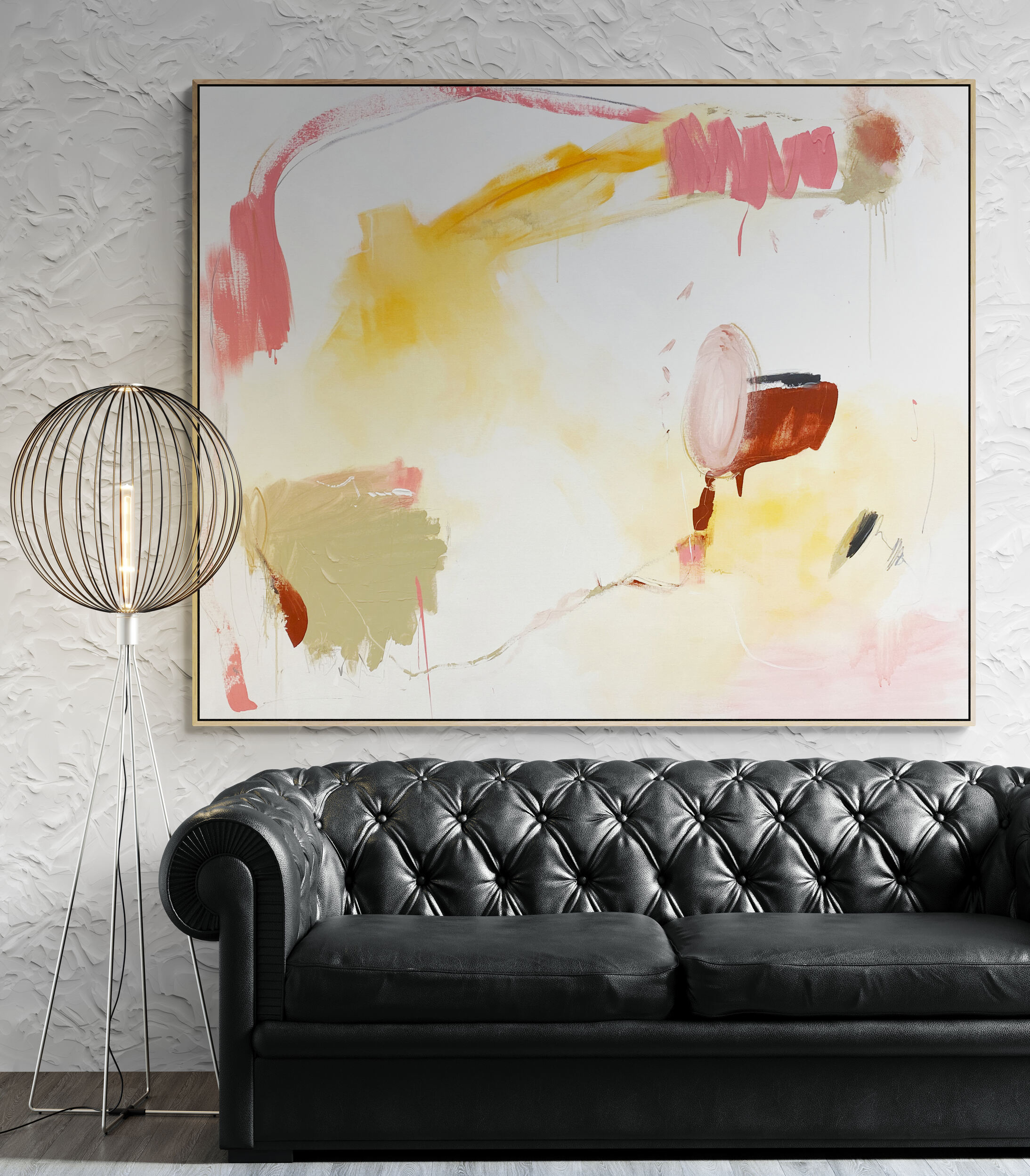 This large painting has areas of texture and a subtle palette of beige, orange, lemon, blush, pink, white, black and grey across the canvas surface.