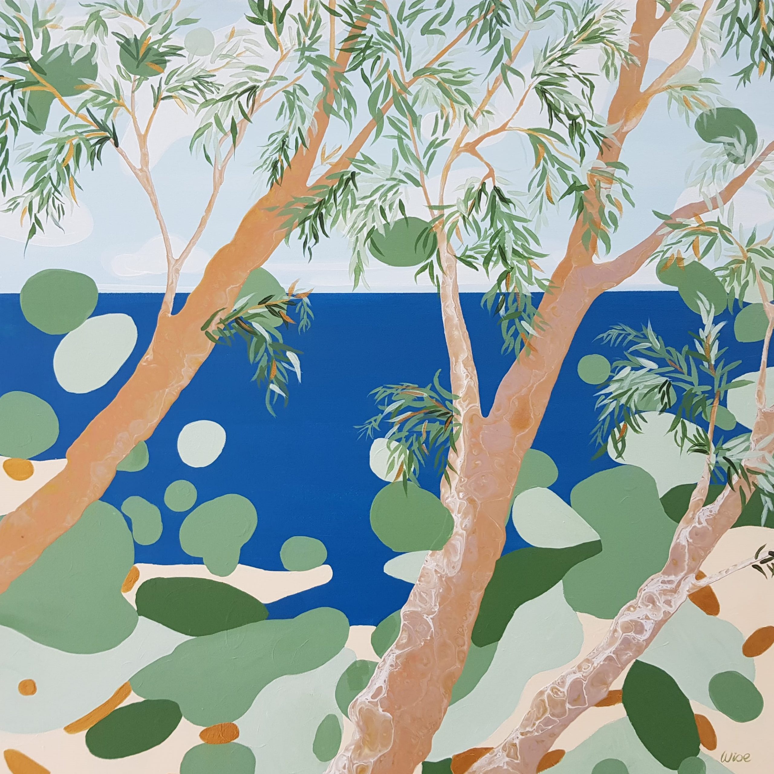 Looking out to sea, through the trees, is restorative and inspiring. ‘Where the bush meets the sea, 4’ is part of series I’m developing in response to my interest in the psychological terrain of landscape painting. Looking out to sea allows space for us to ponder the big questions of life. In this painting, I’ve juxtaposed the willful action of fluid acrylics that evoke the gnarly, deeply textured tree trunks of our hardy seaside bush-land against hard edged colour blocking, as a prompt to consider what is really within our control. If you would like to delve a little deeper, you may see the trees as offering safety and protection or the attitudes and habits that hold us back and keep us in the shade.