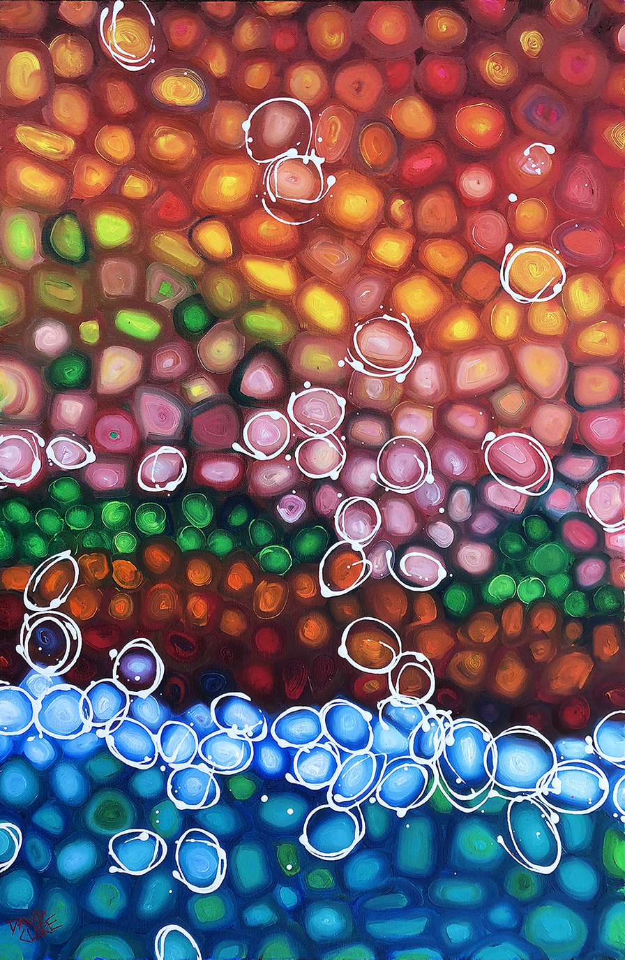 From my current series of abstract Pebble paintings, created by carefully blending rich oil colours to form the pebbles. Highlights of pure white drips to suggest water ripples as the pebbles, or in this case, rocks break the surface of the water. This particular painting was inspired by the Australian outback reds and ochres, and our beautiful beaches.