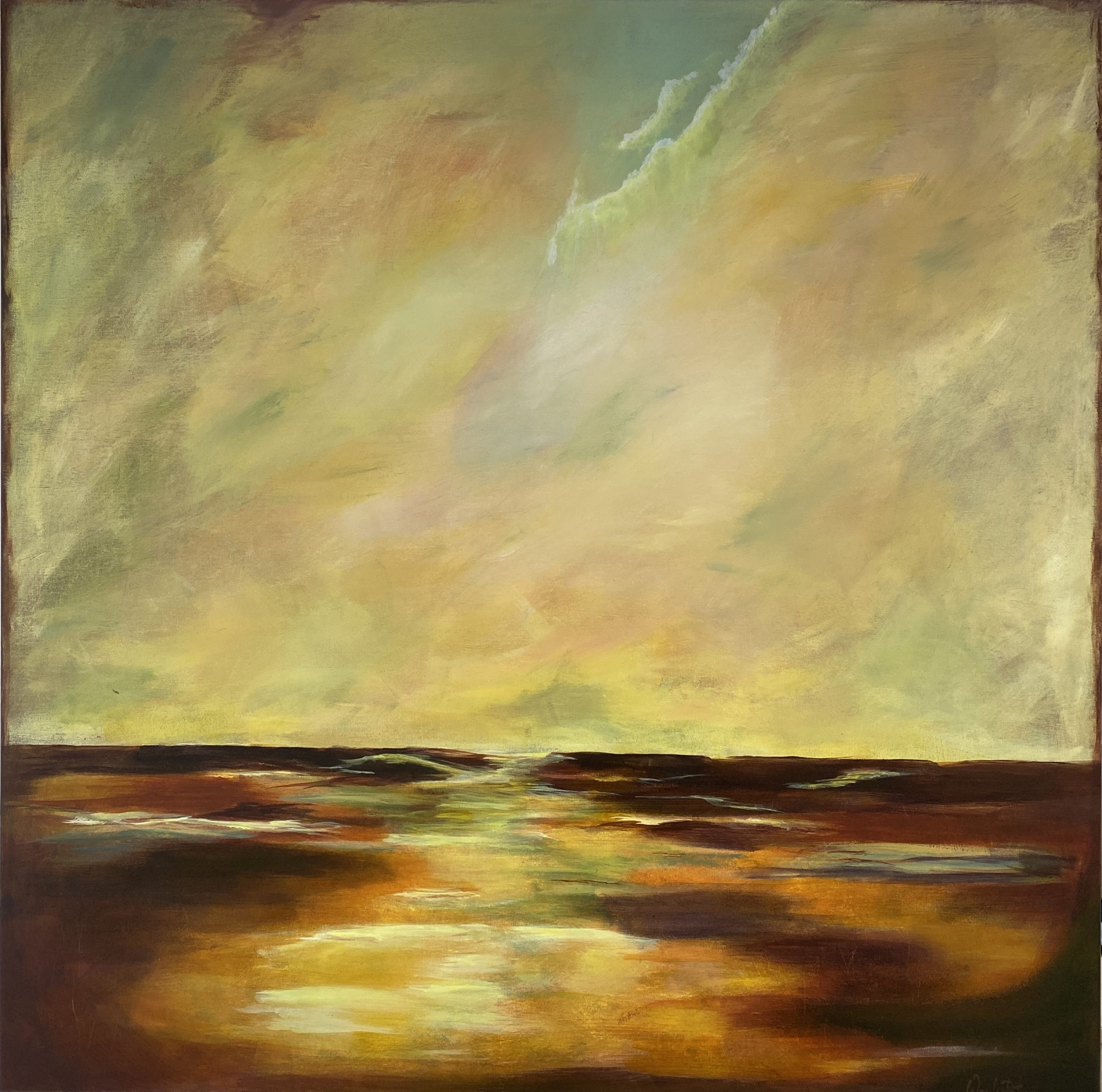 The rich landscape of the Australian outback was the inspiration for this painting, the river beds, the setting sun, the shimmering heat. The wide open spaces, the breathtaking vastness of it all.