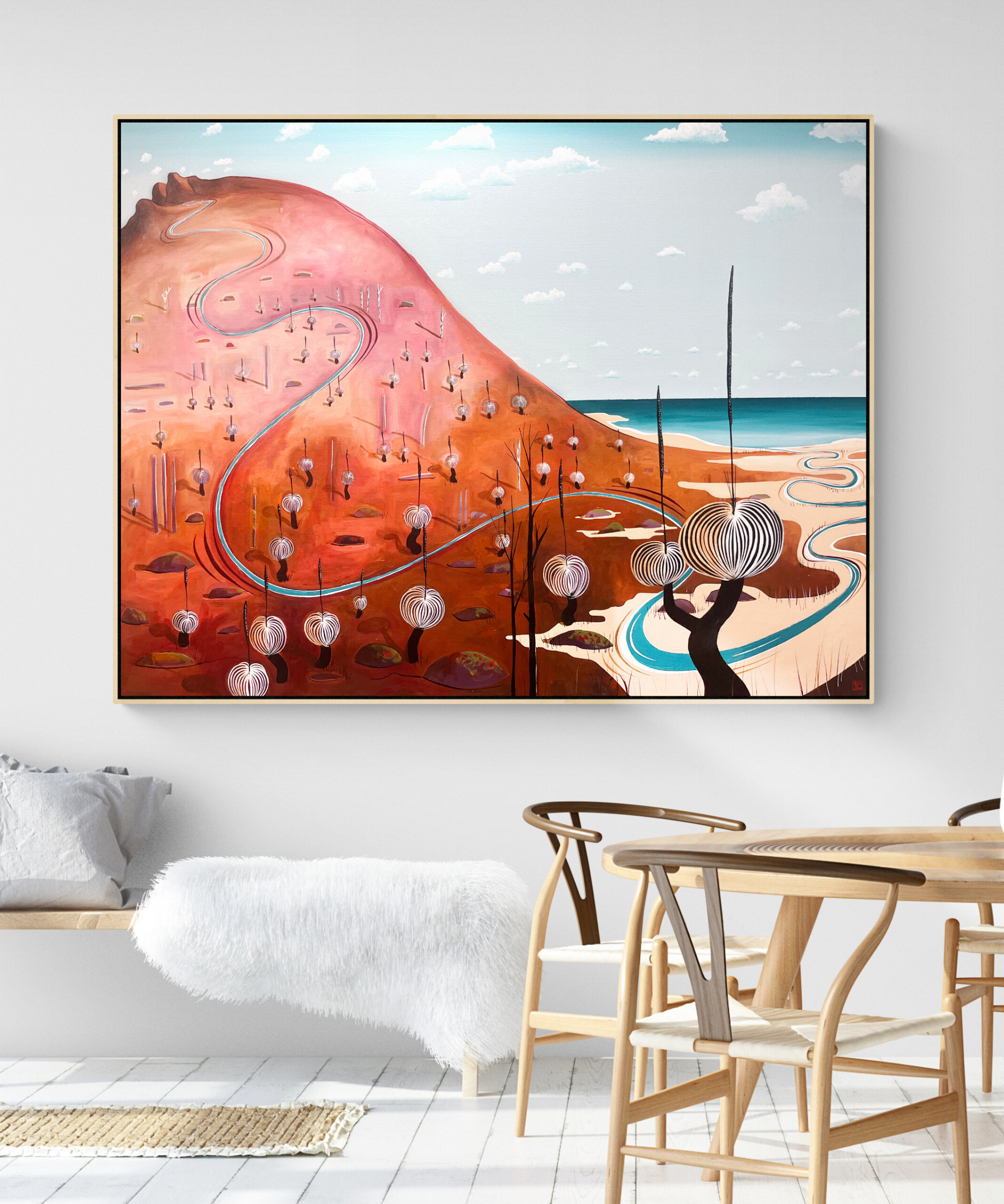 Where The Grasses Meet The Sea by Tania Chanter In this vibrant and dynamic abstract landscape, the canvas is adorned with a dazzling array of colours, capturing the essence of the Australian terrain. The focal point of the scene is marked by the iconic Australian native grass trees, scattered across the composition like living sculptures.