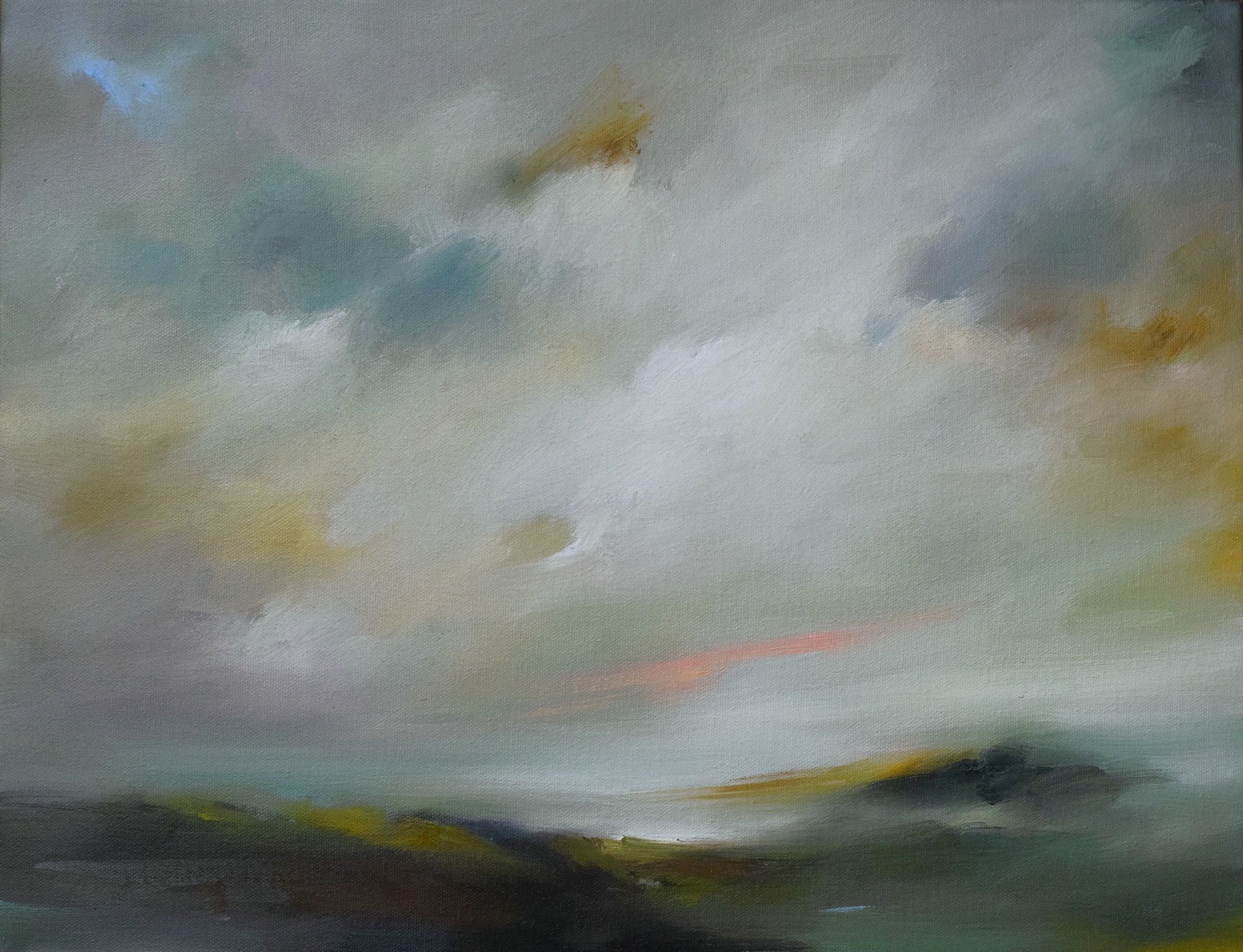 Where The Story Begins – Unlike many of my other landscape paintings, I wanted to show contrast through soft brush strokes and without any palette knife work. You can still see the layers, added slowly and over time, so that little ‘windows’ open through clouds to the sky in the back. Overall, I limited the use of stark white and instead toned it down with very pale yellows and blues, giving the painting a very warm hue.