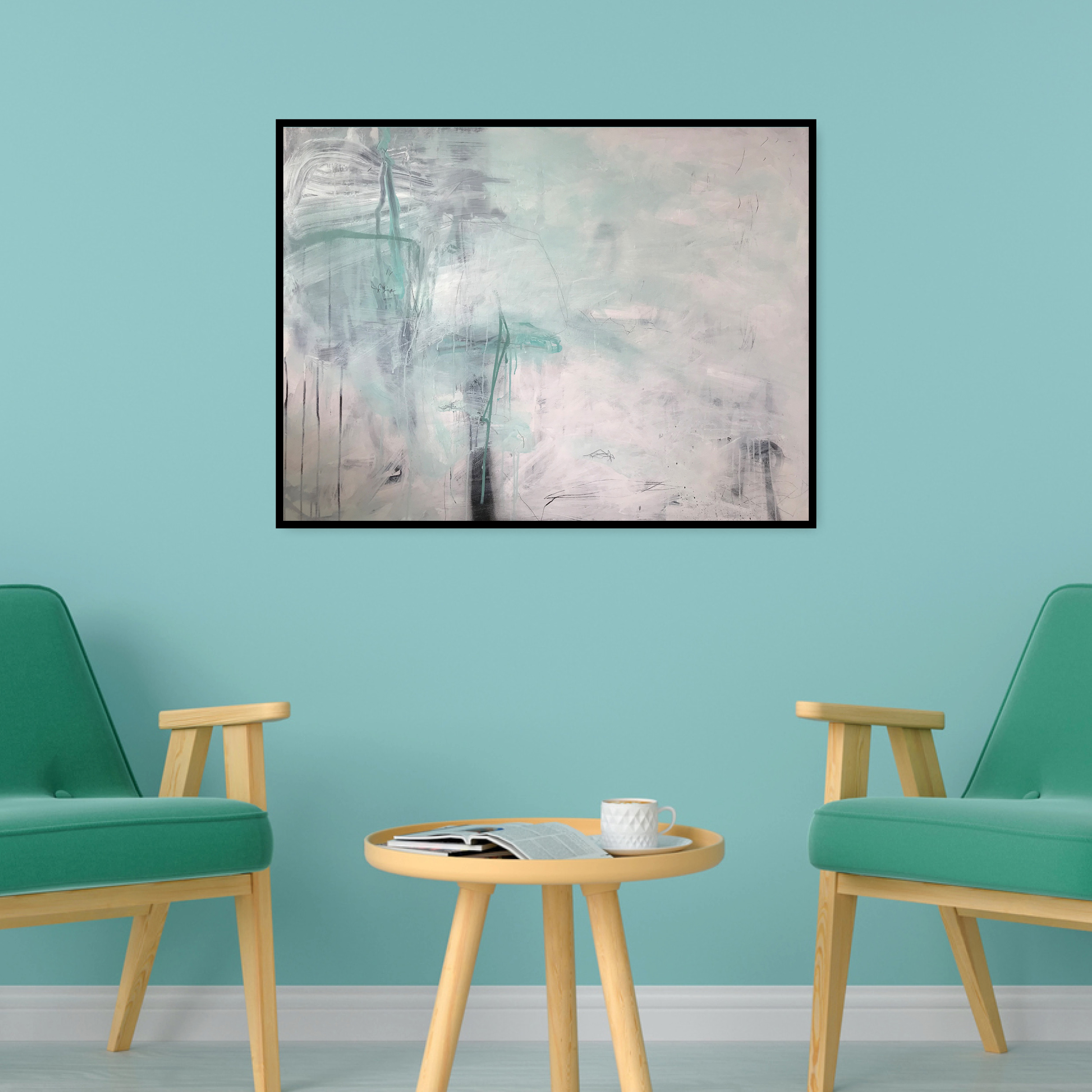 Loose and expressive best describes this abstract painting. The longer I spend painting, the less I think about what my hands are doing and the more intuitive the process becomes. My graphic design training always comes in to play, as I subconsciously create balanced compositions. I’ve focused on my art practice these past few years and enjoy seeing the development in my work. Sometimes less definitely is more and I worked purposely with a limited colour palette on this artwork. Black, white and a touch of teal create a painting which will hang well in any room. The title suggests that if you can, be where you want to be. It that’s not possible now, then work towards it. I hope this artwork helps to inspire you to achieve your dreams!