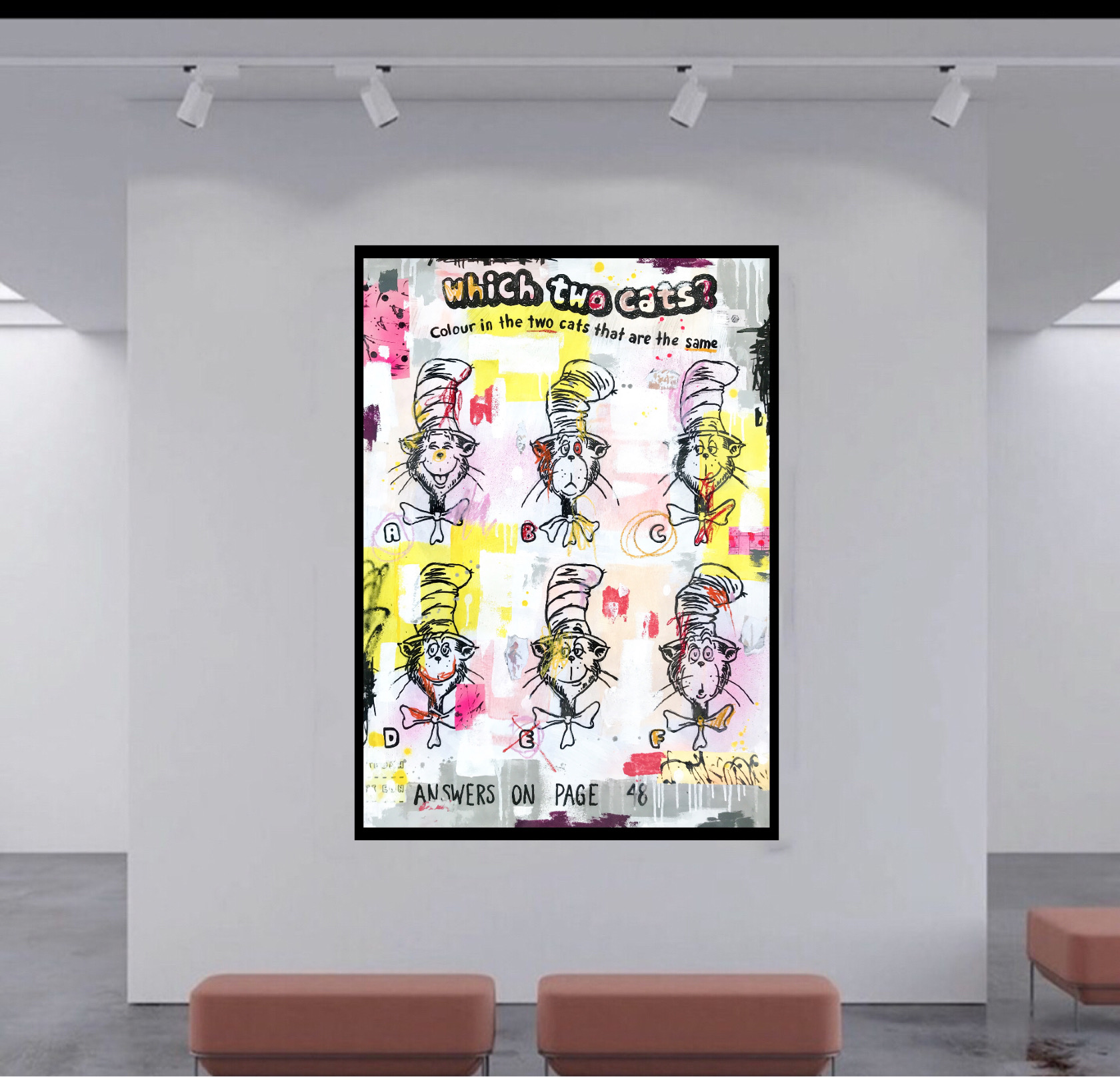 This original artwork is made using Recycled Paper, the vintage image of Cat in the Hat puzzle book was then sketched on with pencil and Paint Pens and further overlaid with paper and paint, then finished off with oil sticks.