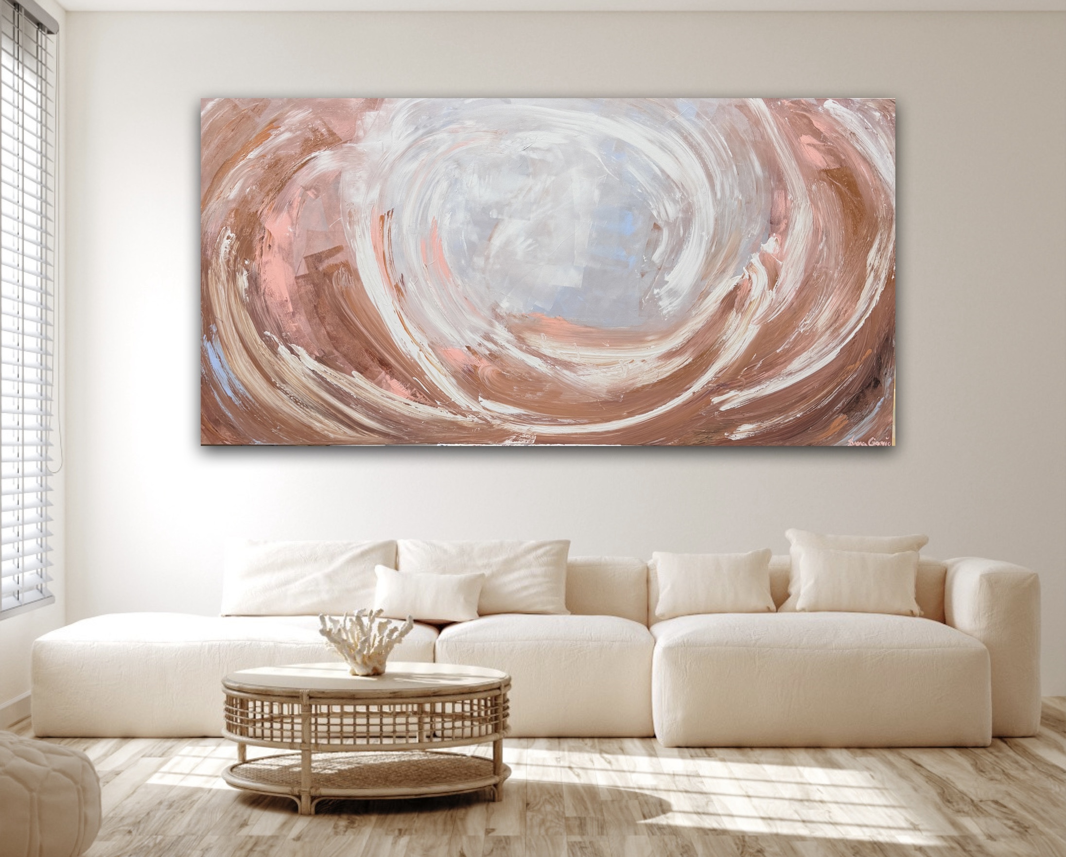 ‘Whirl of Grace’ is an artwork with a warm sweeping energy creating a sense of calm movement. Soft blush tones, earthy browns and hints of blue bring a peaceful feel to this piece.