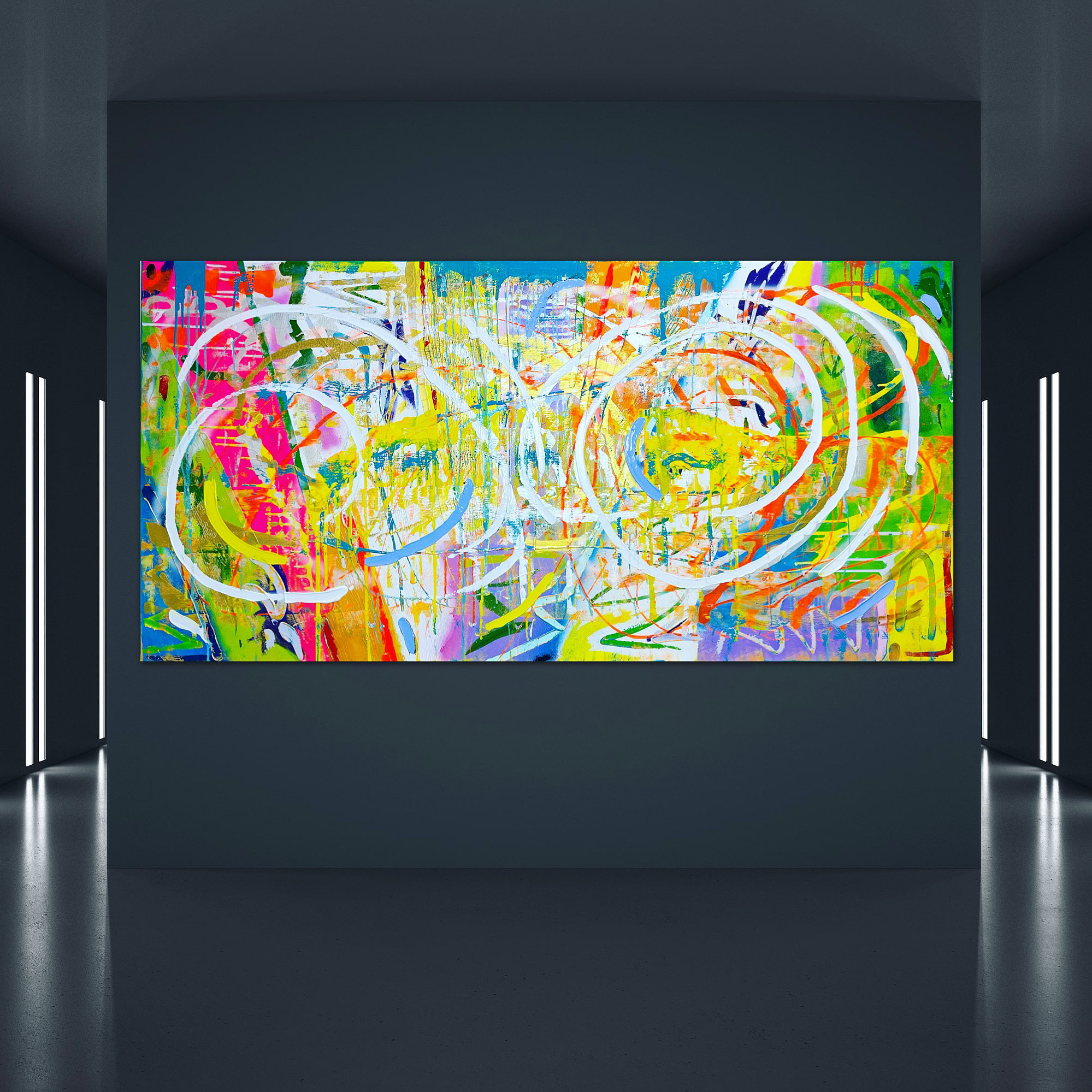 A large, colourful abstract painting inspired by Alicia’s two year who is a little whirlwind of colour and energy!