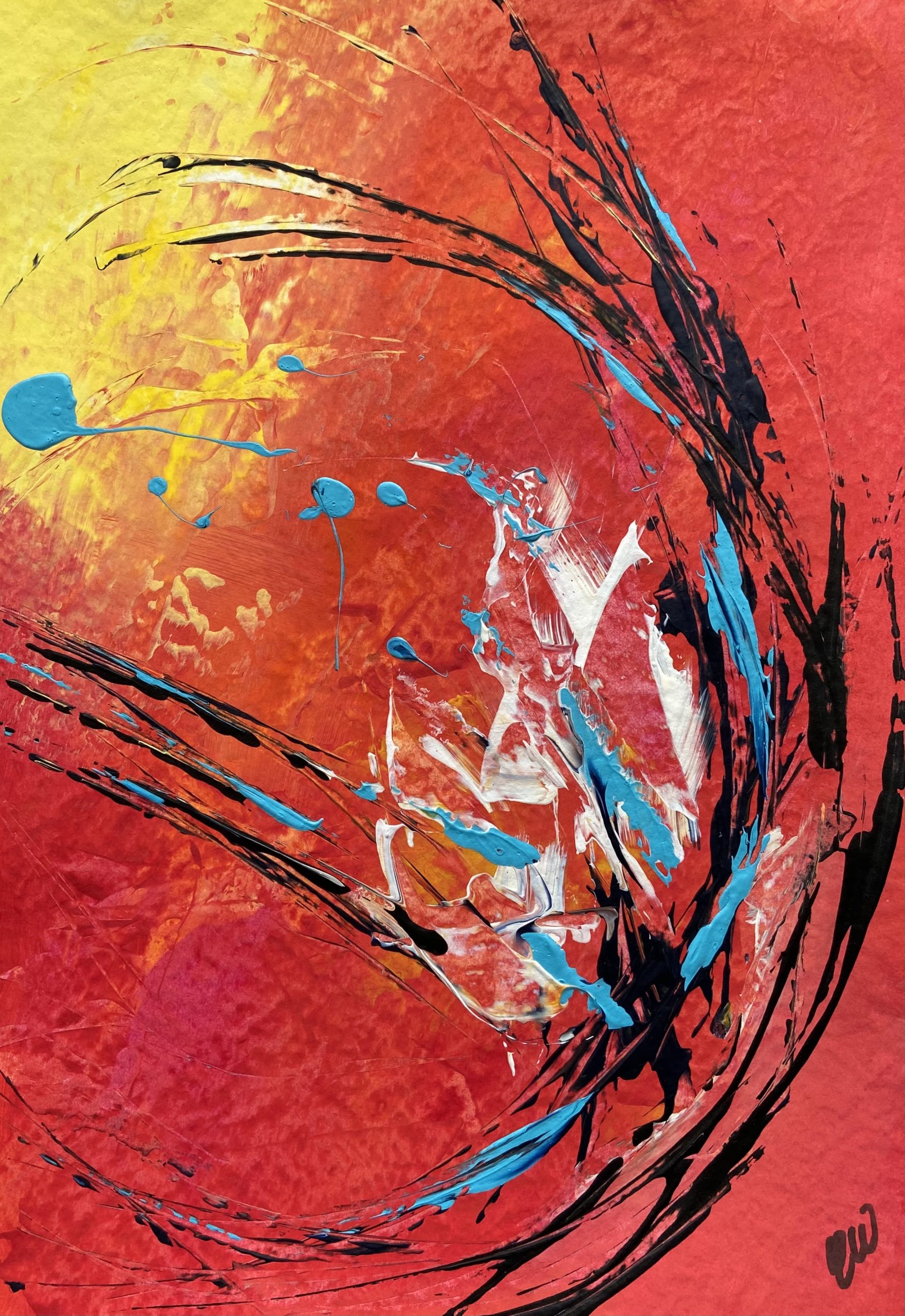 A bold abstract piece with lots of captured movement and an electric feel! Some images show what this piece looks like framed. Frames not included. 29.7 x 42 cm (A3 size) Acrylic on paper. Requires framing.