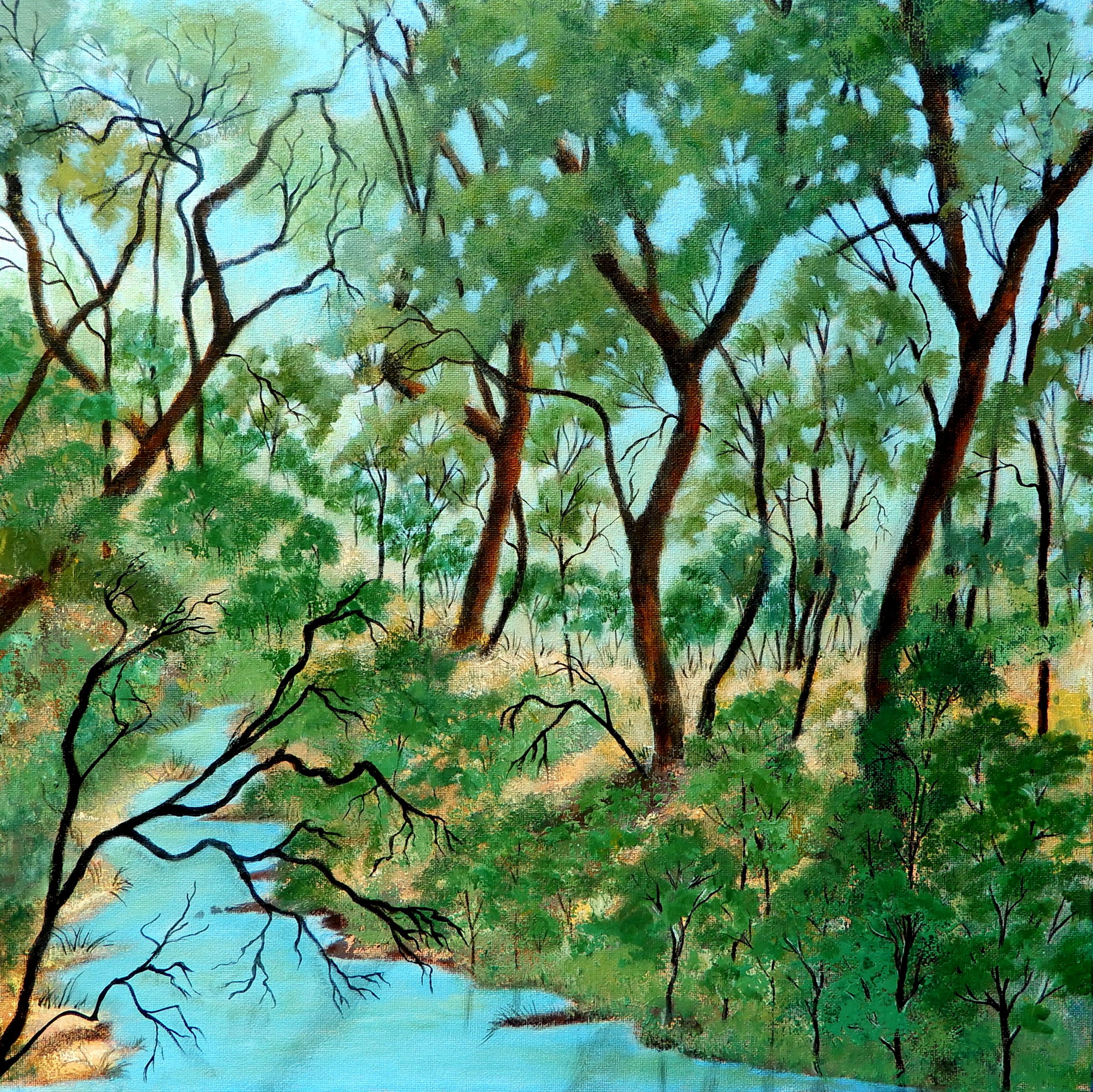 Light through gum trees in the bush, a creek whispering its way across sand, standing on a hill looking out at that view on a walk – it’s a very happy place.