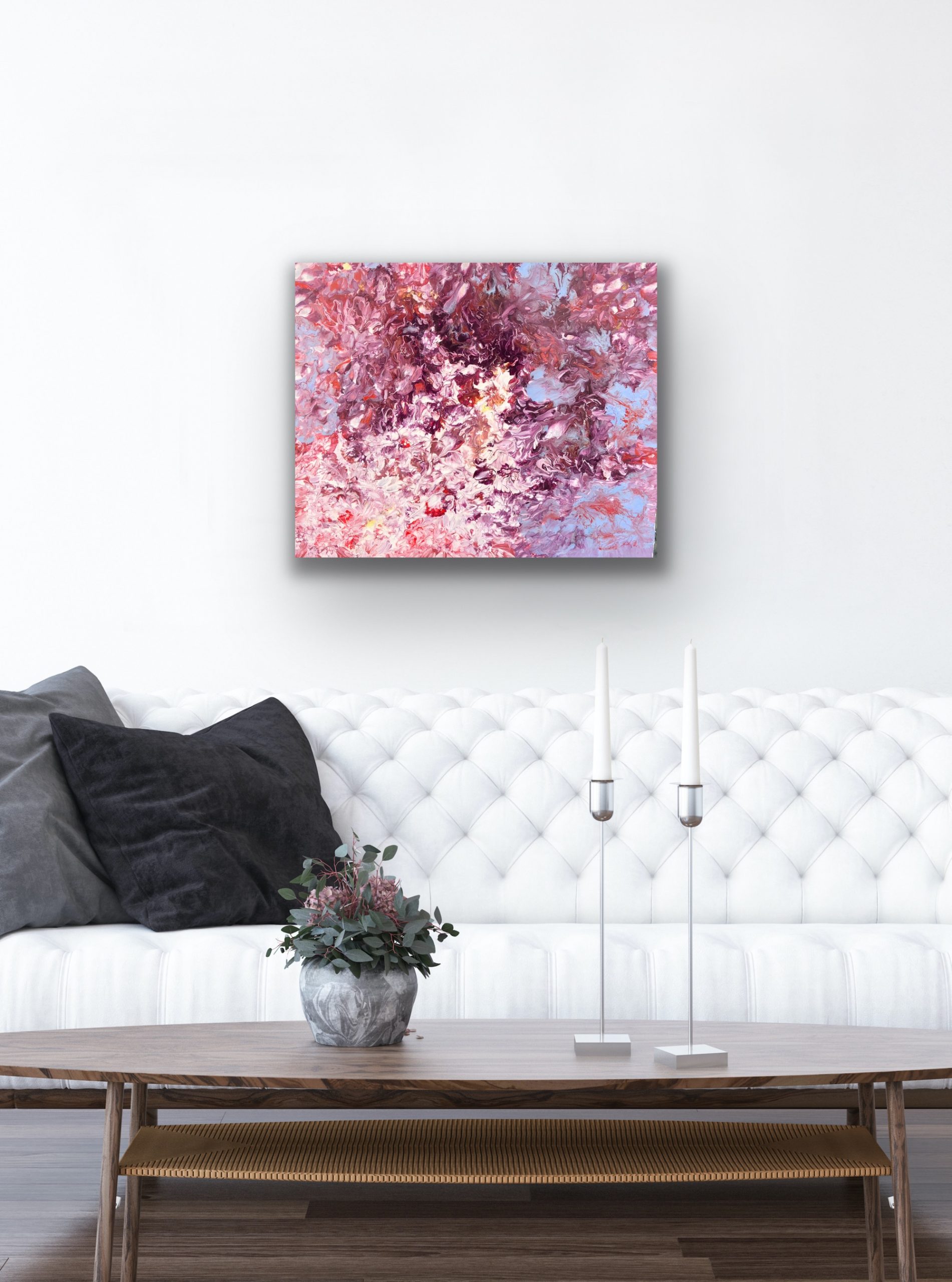 Whispering Petals by Theo Papathomas is a very soothing and tranquil painting painted in a soft colours. Petals come together to create this beautiful harmonious composition of colours. Petals dancing next to each other to create a beautiful veil of colours covering the whole landscape in beautiful pinks .The painting is signed and dated 2020 at the back and comes with a certificate of Authenticity.