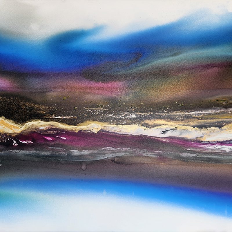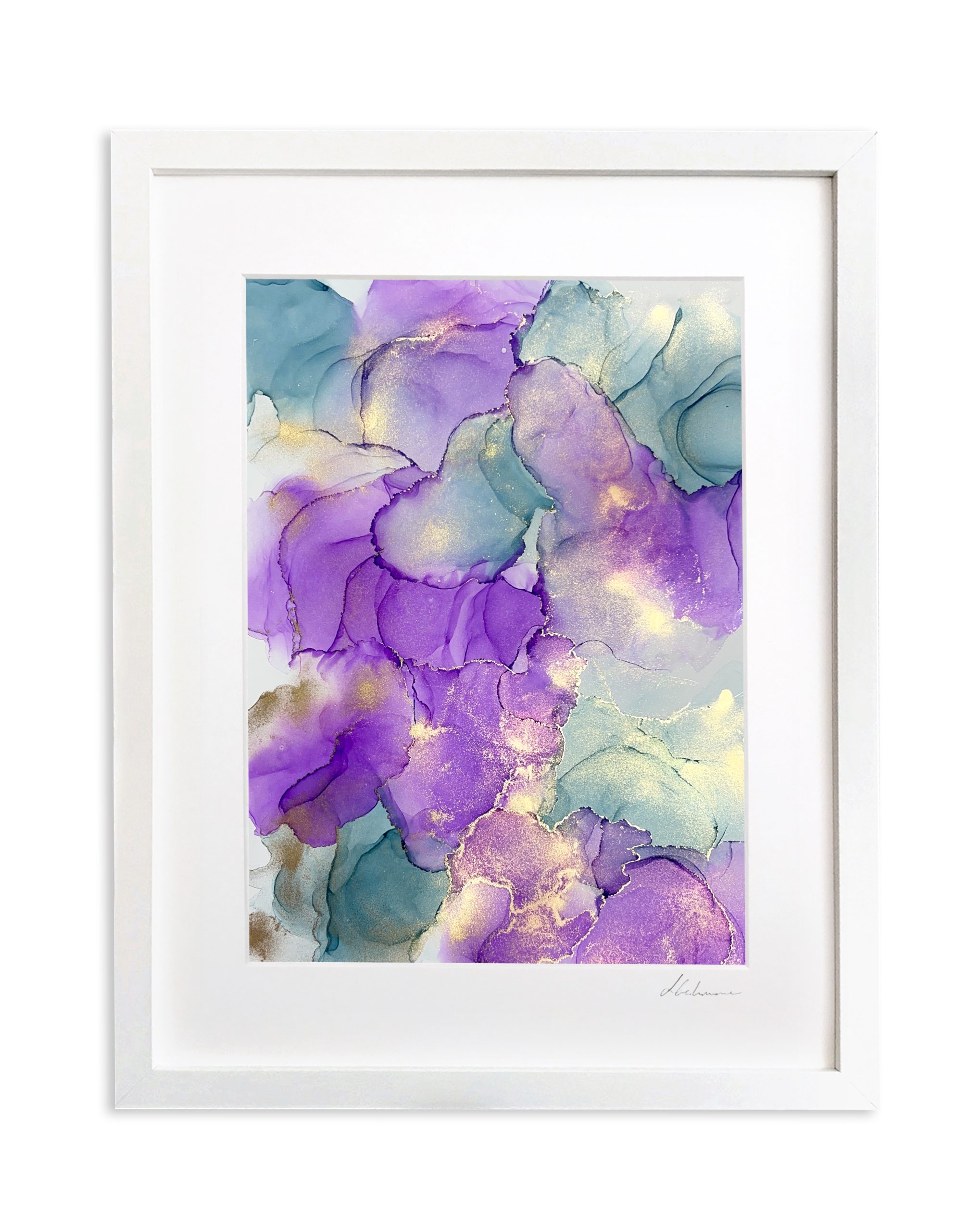 Discover the captivating beauty of “Whispering Skies,” an original Alcohol Ink artwork that mesmerises with its swirls of warm pinks, soft purples, and serene cloudy blues, all highlighted by the luxurious sheen of metallic gold. This A4 masterpiece is framed in white, creating a perfect contrast that enhances the artwork’s ethereal glow.