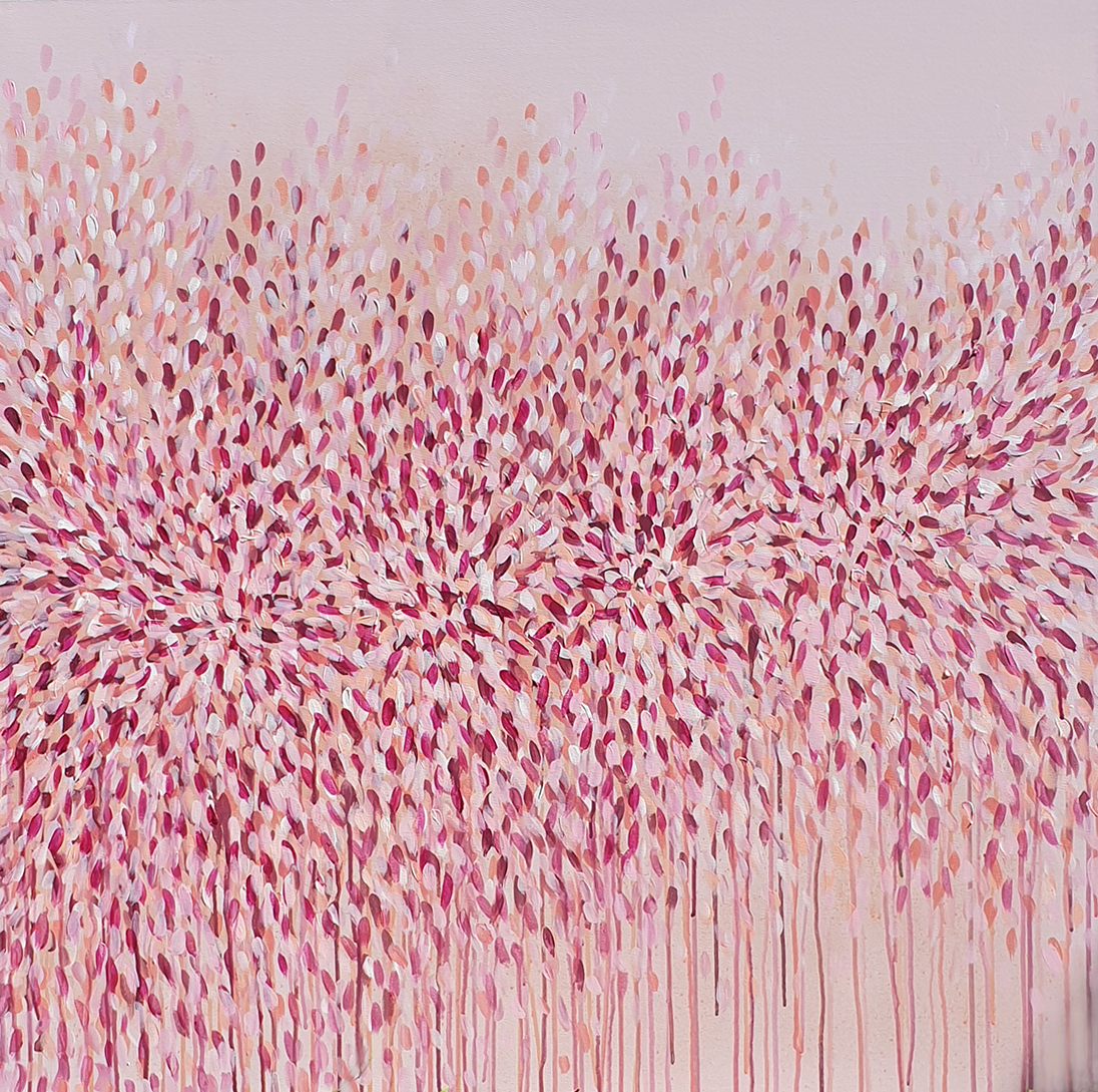 Whispers for You in Pink by Leni Kae – a pink abstract landscape artwork by Sydney artist Leni Kae. Inspired by cherry blossoms and symbolic of love, unconditional adoration, and whispers of truth. A beautiful and romantic abstract artwork for interior design, particularly bedroom and lounge room interiors.