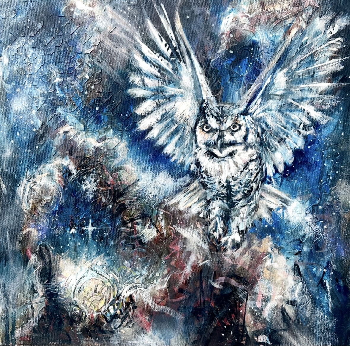 “Whispers from the Blue Dot” by Tracy Lee Warusevitane – An owl soars through a swirling cosmos, carrying ancient wisdom across the stars. It speaks not of answers, but of perspective—reminding us that on this tiny blue dot, we are fleeting, free, and full of potential. In the vastness of the universe, what matters most is how we choose to live, love, and explore.