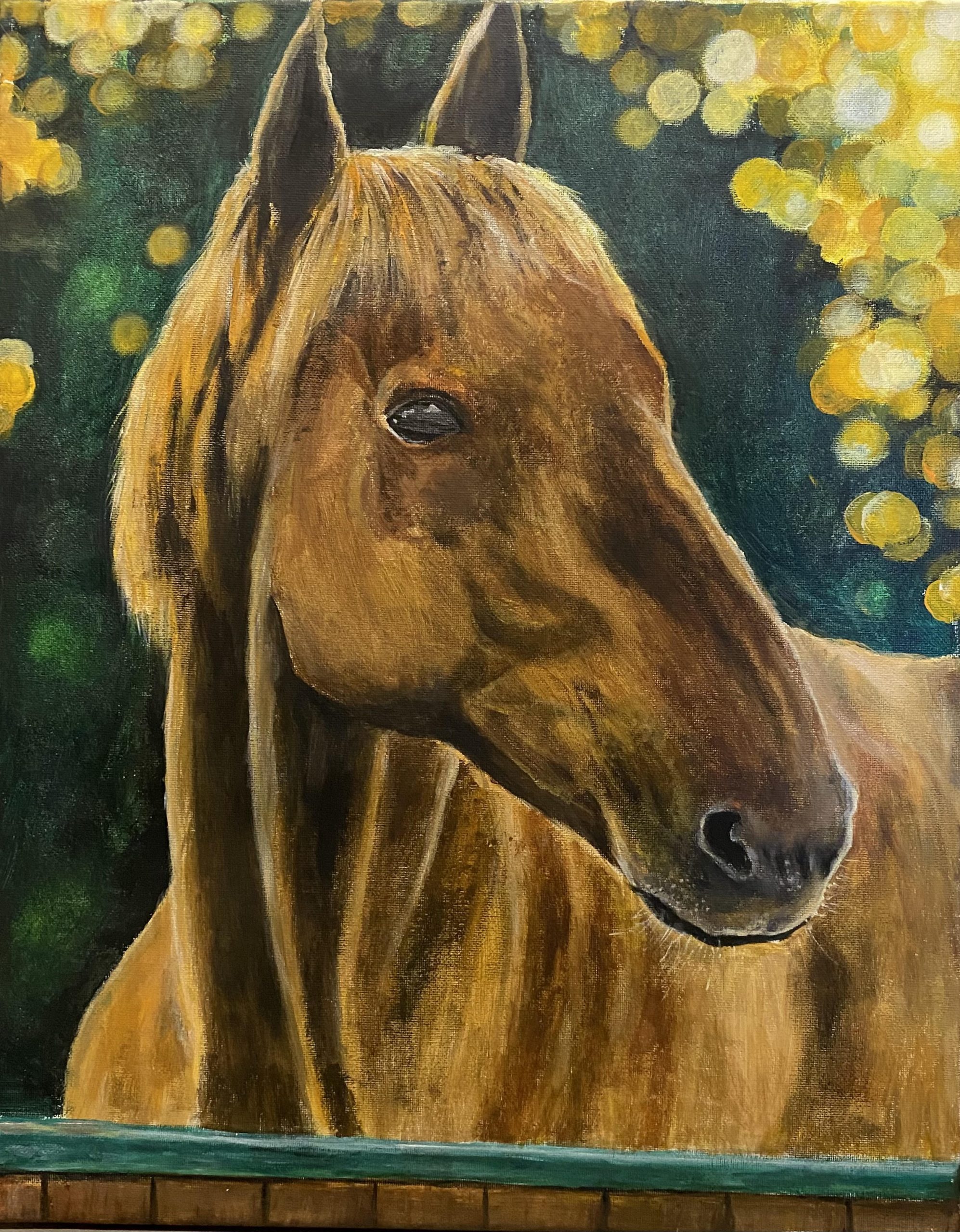 In this breathtaking horse painting, the majestic creature stands tall against a backdrop of rolling hills and a vibrant, golden sunset.