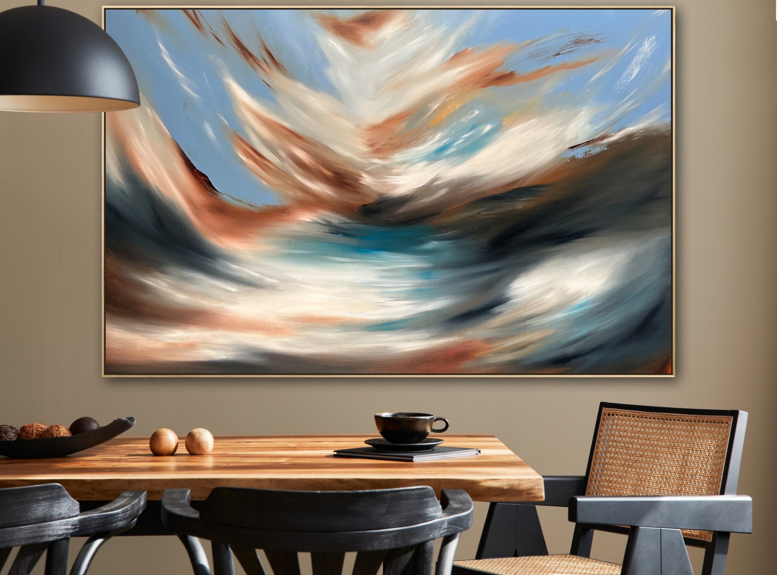 This large, oil abstract painting celebrates movement and the release of colour with use of light showing a perceives distance. The edges have been painted to ensure a nice neat finish and so no exposed canvas will be seen if the painting is framed and can be hung in any direction.