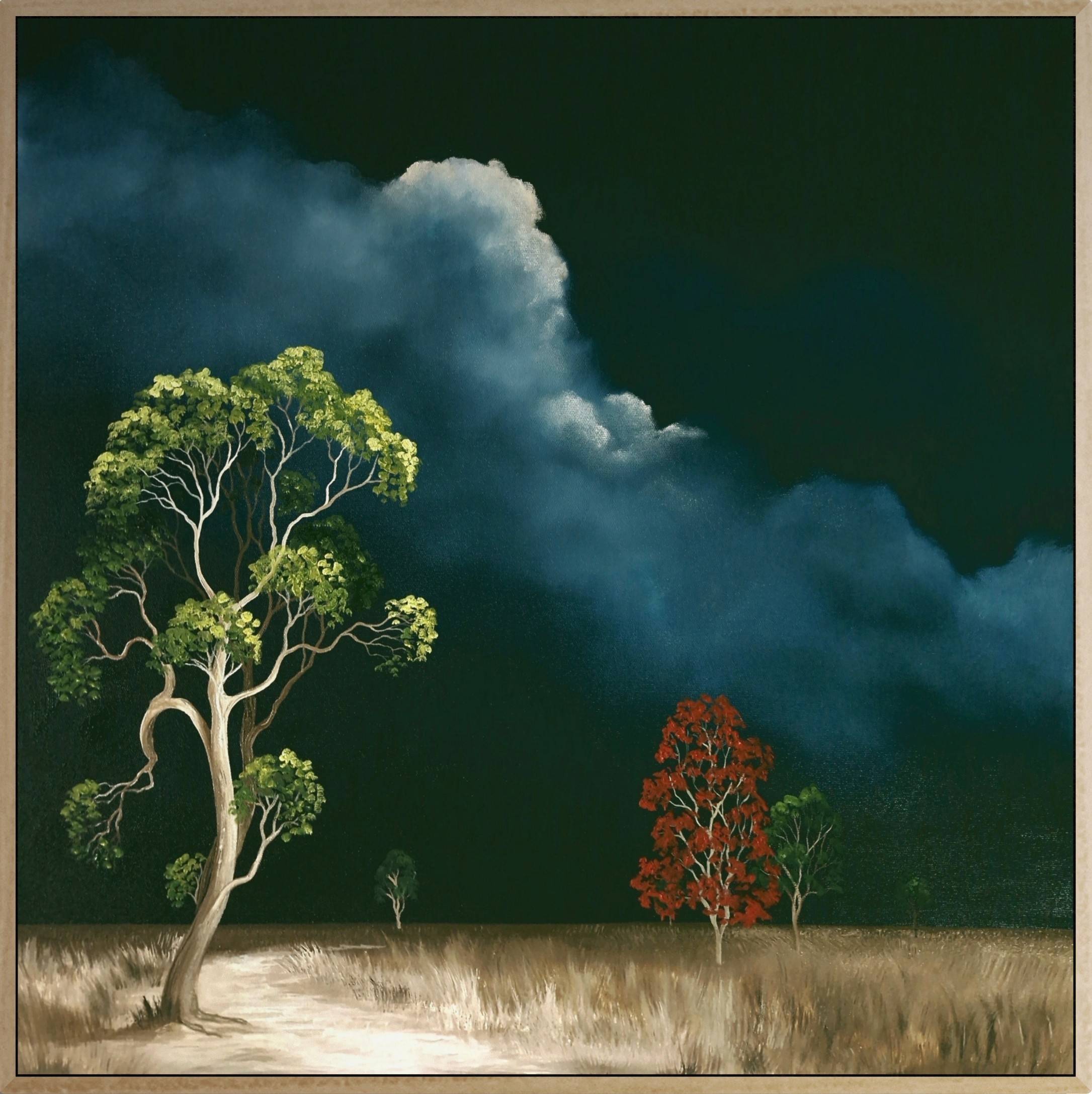This piece captures a quiet, reflective mood. A deep teal sky stretches overhead, its rich hue contrasting with billowing clouds edged in soft highlights, as if the sun is just out of sight. The ground below is a patchwork of earthy brown and bleached grass, dry and weathered. A narrow, meandering path winds gently through the foreground, leading the eye toward a gnarled, bent tree. Despite its twisted form, vibrant green leaves unfurl from its branches — a quiet symbol of resilience and renewal. In the distance, more trees dot the landscape, one blazing in bright red foliage, a striking reminder of change and the beauty it can bring. The atmosphere holds a hush, inviting stillness and introspection.