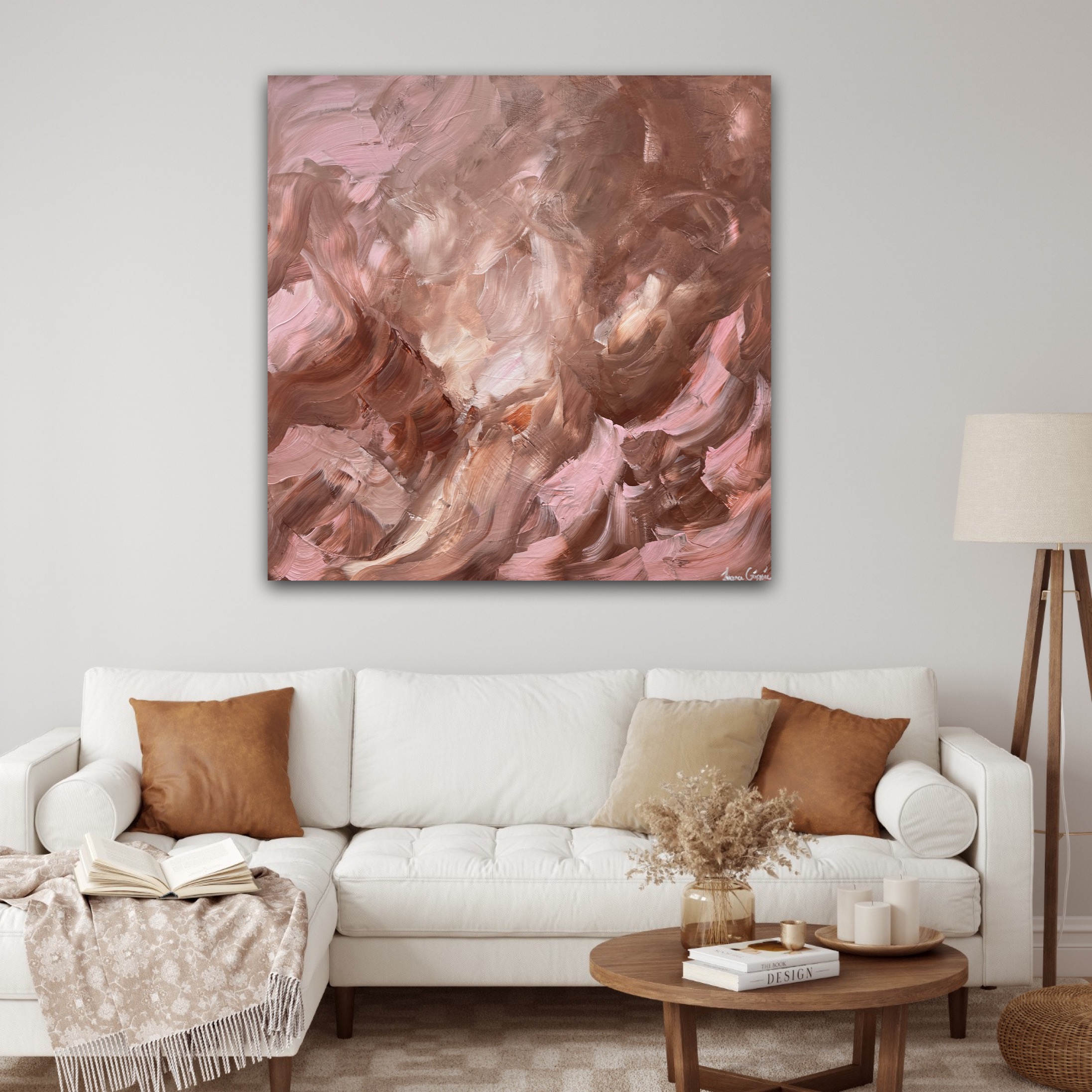 A blend of brown and dusty pink tones, creating an earthy and grounded feel. The organic shapes and textures evoke natural elements where as the dusty muted pinks add a touch of warmth and softness.