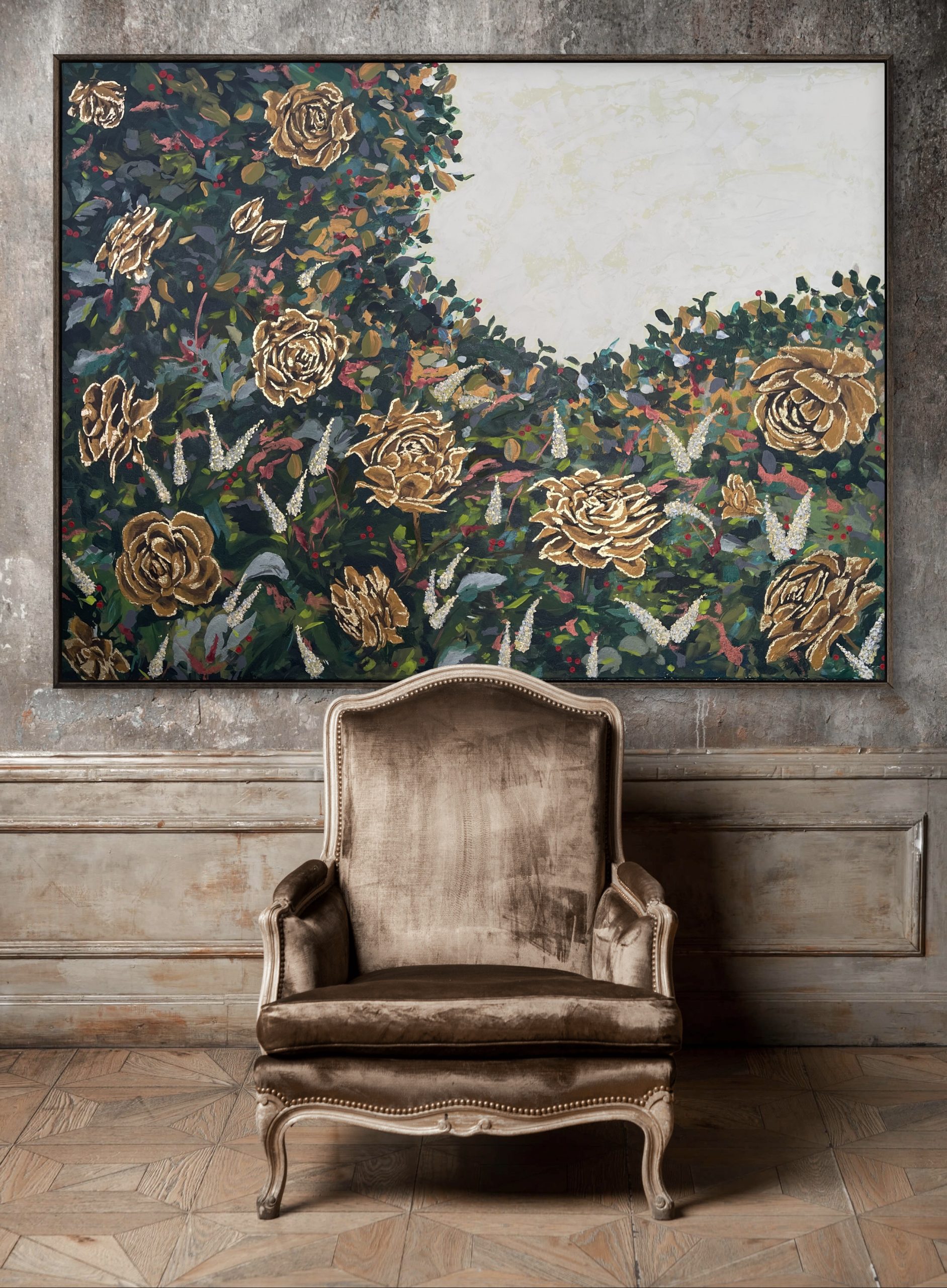 Abstract Rose Bush in Acrylic with touch of gold leaf on stretched canvas size 91cm x121cm