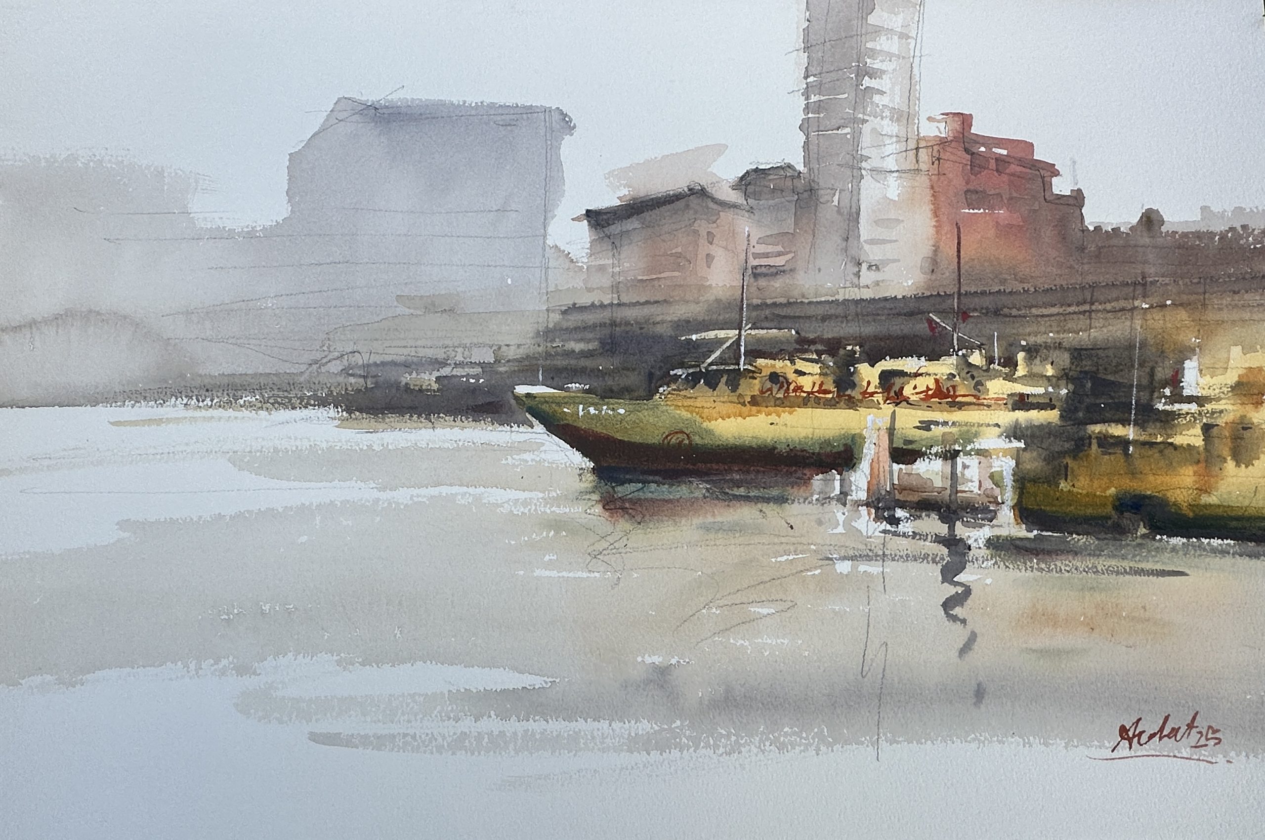In the misty stillness of early dawn, the city’s pulse quiets to a hush. A lone ferry, painted in hues of gold and crimson, waits patiently at the sleepy dock, its reflection melting into the soft ripples of the water. The towering silhouettes of buildings loom like ancient guardians, their shapes softened by the thick morning fog. For a fleeting moment, time seems to pause — the harbor holds its breath, cradling dreams of journeys yet to come and memories drifting gently in the mist.