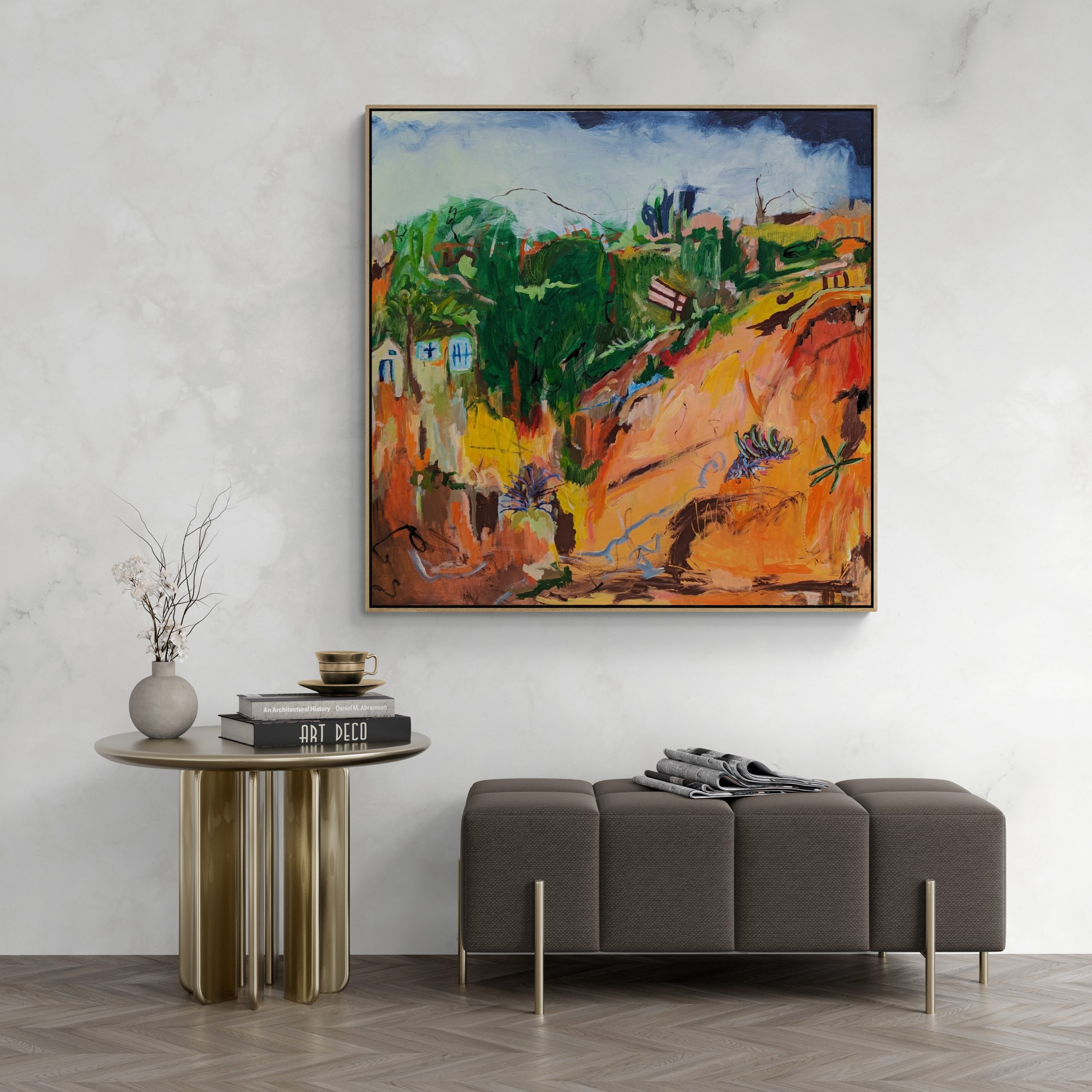 Dominant hues of orange, green, and yellow saturate the canvas, mirroring the rich and vibrant colors that can be found across the Australian terrain. These colors are not only a representation of the natural world but also a reflection of the emotional resonance that nature evokes within us. The fiery orange suggests the sun’s relentless embrace, while the deep greens and yellows embody the life force that thrives even in the harshest of conditions.