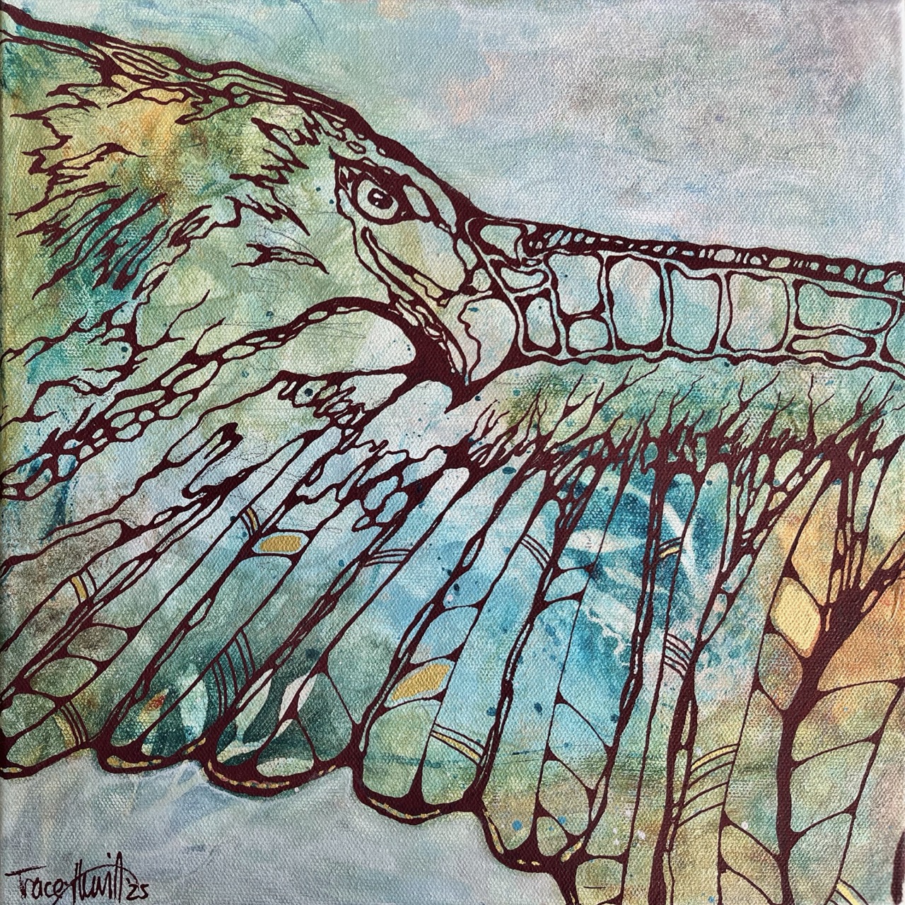 This piece is one of a series painted to explore that fascination. The underpainting includes stencilled botanical forms and loose painterly marks, which peek through the eagle and her wing, as if revealing hints of the mystery that lives between this life and the next..