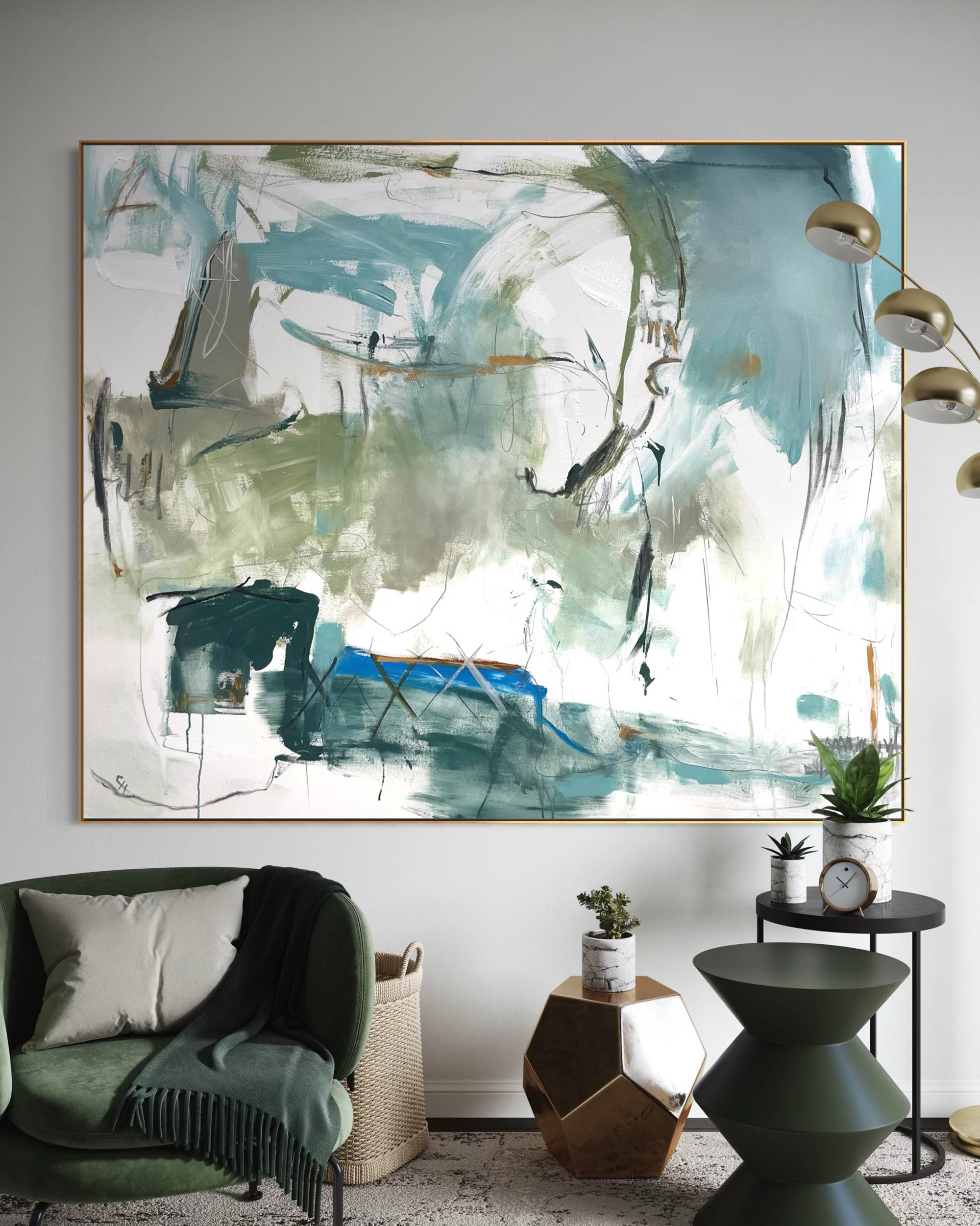 This striking statement piece was inspired by life’s unexpected twists and turns. The complex mark making and light texture is combined with a beautifully balanced moody palette of tonal greens and blues, grey, black, white and a hint of ochre and redish brown..