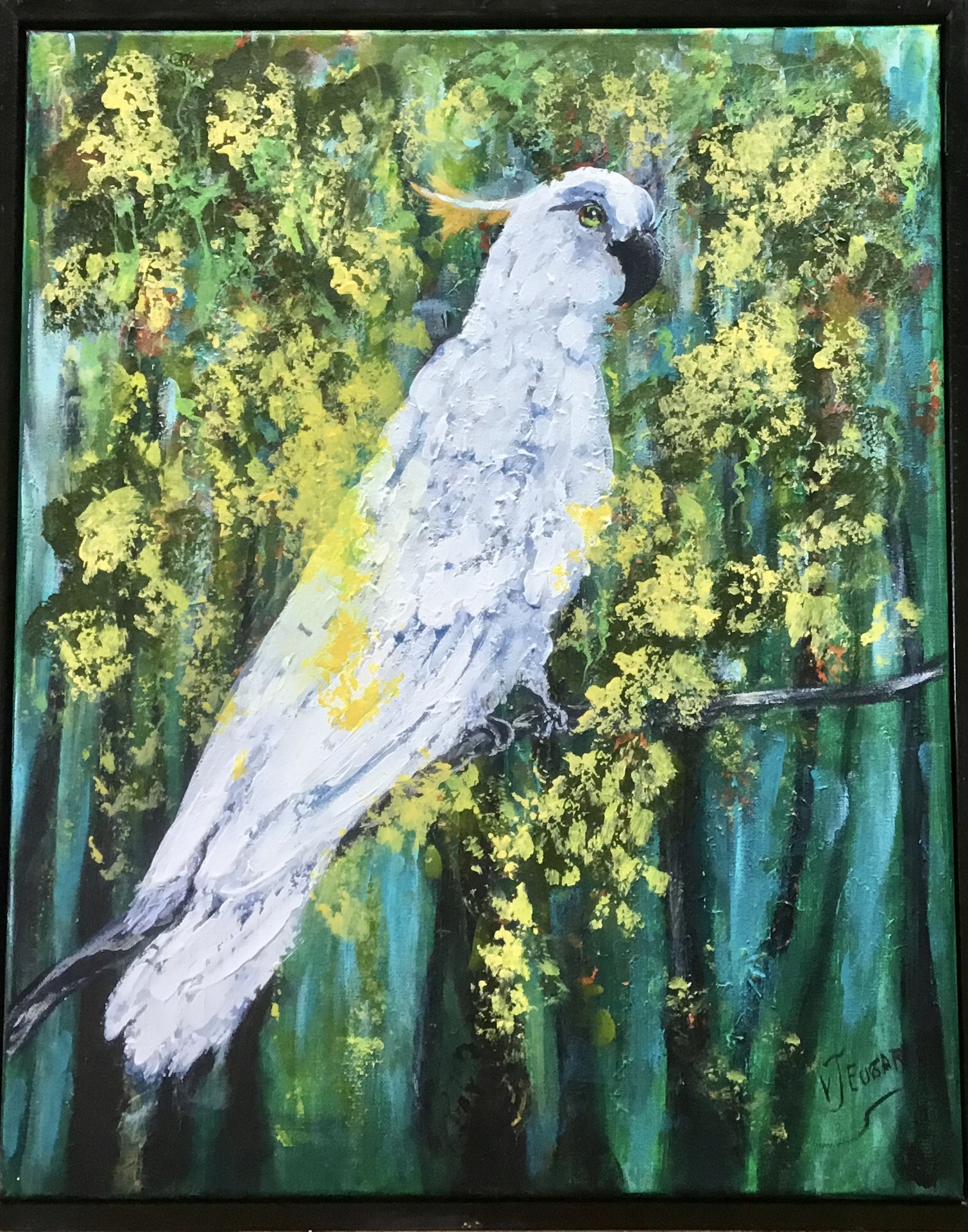 White Cockatoo by Valerie Eugarde:- A very textured painting with Cocky sitting amongst the Australian bush, lots of wattle in bloom and it’s a typically Australian setting. Original one off painting.