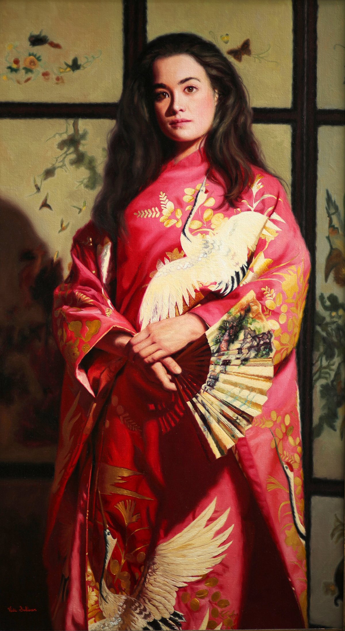 In this painting I paid particular attention to the silk Kimono which is a beautiful Wedding Kimono from the 1950’s and is covered in embroidered White Crane symbolising great prosperity, good luck, and grace in your life