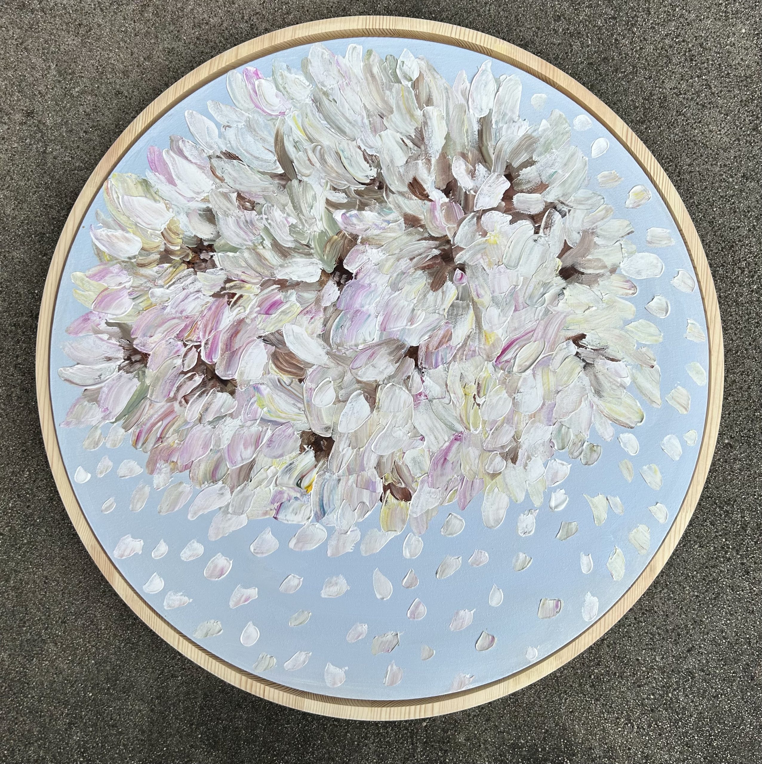 White Jewels by Theo Papathomas is a painting with lots of layers of beautiful white iceberg roses and petals covering the sky . The sky becomes a bouquet of petals dancing to their songs . I tried to create this beautiful composition of soft colours of icebergs and petals . Capturing the beautiful colours of the petals, like musical notes dancing in the sky, painted in acrylics with a pallet knife. Painted with a pallet knife makes the painting full of energy with lots of acrylic paint creating so much texture. The painting comes with an external frame.The painting is signed and dated 2023 at the back and comes with a certificate of Authenticity.