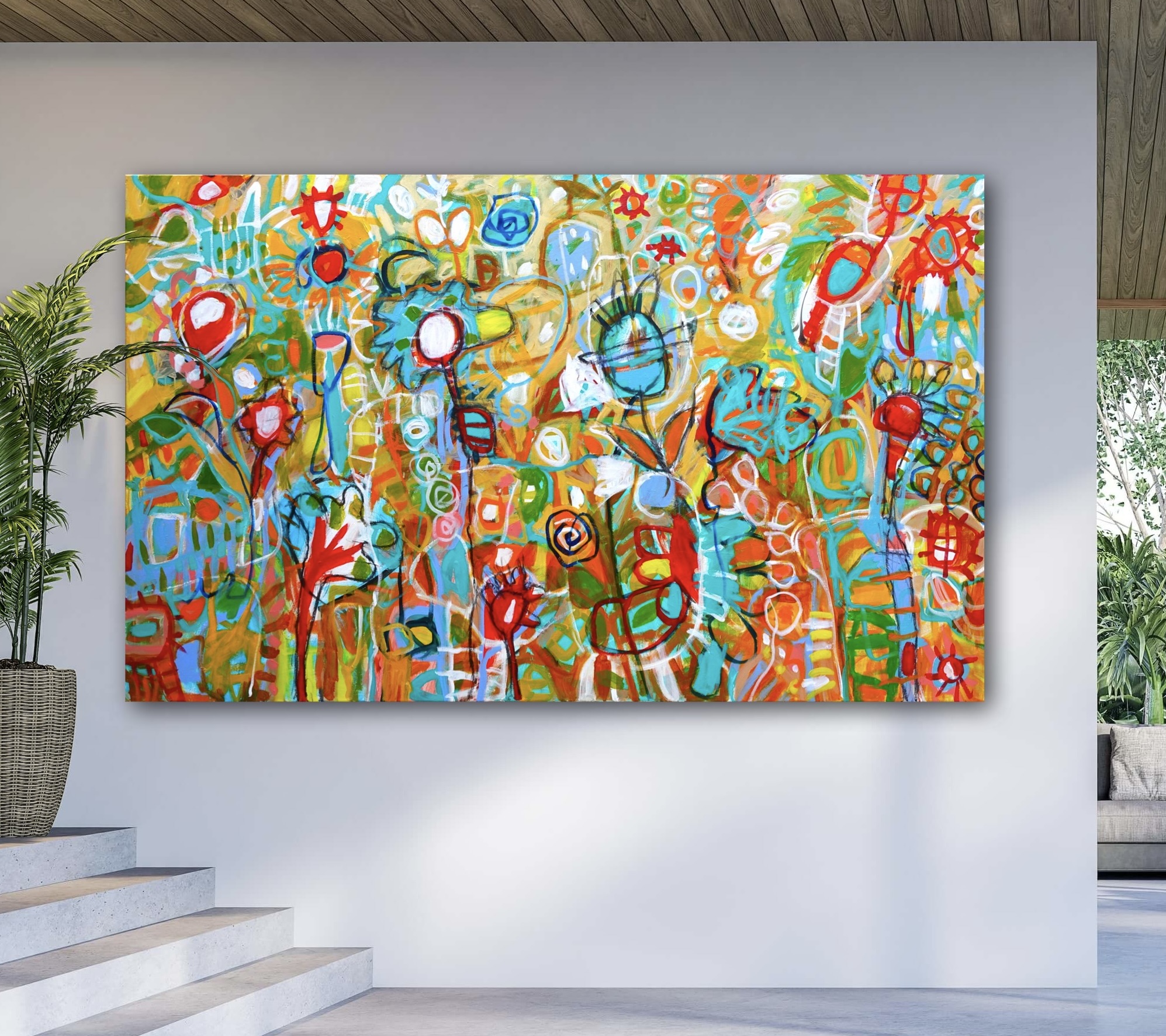 This work is oil and acrylic on 122 X 198cm on 12oz 100% unbleached Cotton Duck, Stretched on a Kiln dried Frame, Ready to Hang or to be sent to the framers for an exterior frame. It is signed on the front and sent with an artist cv and certificate of authenticity.