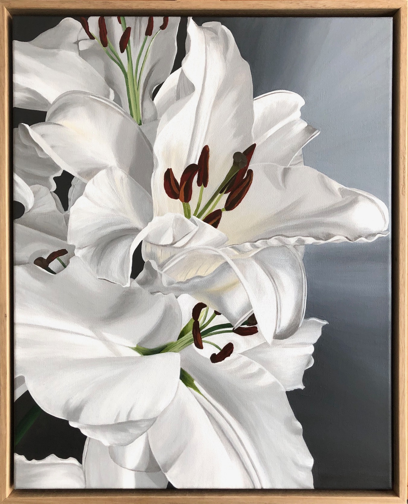 This work was painted for an exhibition which was cancelled, a common theme these days! I have always loved these Oriental Lilies for their perfume and for their serene appearance and the effect of purity they portray. The reference was a recent photograph I took of a bunch of lilies which I couldn’t resist painting. The folds and curves of the silky soft petals are a delight to paint and, I hope, to look upon! This work comes with it’s own solid timber frame, which I feel gives a solid, elegant finish to the work. The sides of the canvas are painted black to create an even shadow-line within the frame.