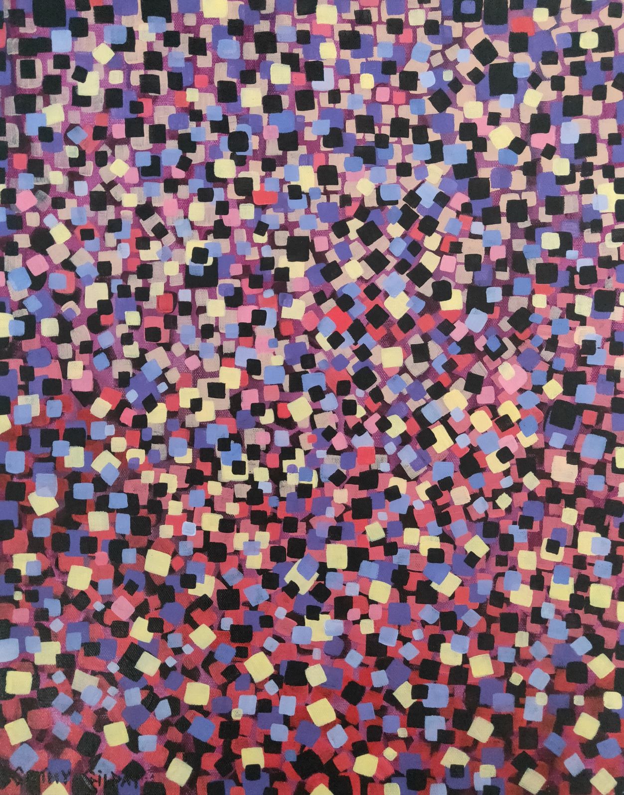 White Noise by Cathy Gilday – This colourful abstract expressionistic painting represents what “white noise” looks like in my mind’s eye. The piece is very busy, with layers and layers of overlapping marks, created in various shades. The sides are painted, sealed, signed back and front and ready to hang.