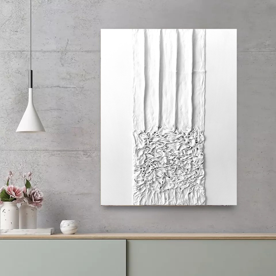 The artwork is a natural pure white colour with shades of grey coming through the textured geometrical aspects.
