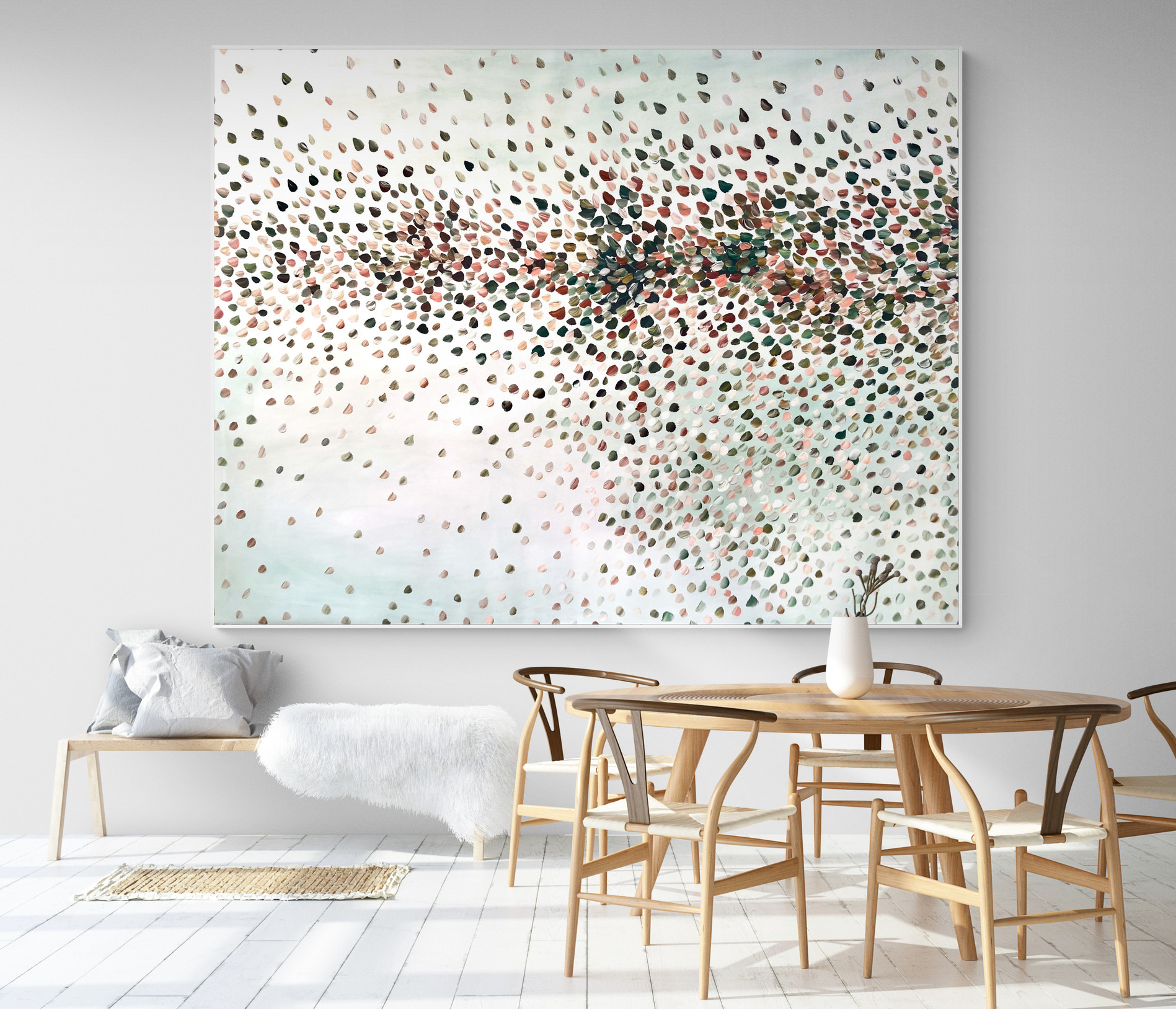 A painting with soft colours of the petals flying in the wind creating this beautiful bouquet of petals in the sky with lots of texture. Beautiful flickering petals dancing over the sky shining like stars. Petals weeping onto the landscape creating this veil of petals covering the sky in soft colours. A composition of colours and rhythms of petals dancing like musical notes in the sky making this painting very gentle and poetic . A very peaceful and tranquil painting with so much depth. The painting does not come with an external frame.The painting is signed and dated 2021 at the back and comes with a certificate of Authenticity.