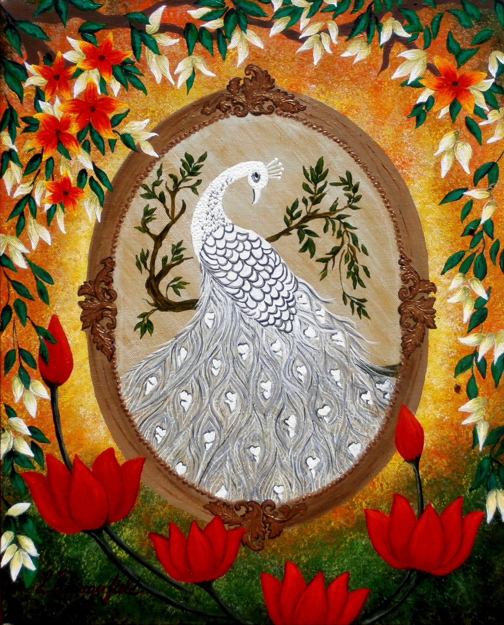 A combination of warm vibrant colours, India’s national flower ‘lotus’, and India’s national bird ‘peacock’ were the foundations for this artwork. My imagination ran amok. Inspiration for this painting evolved by combining an image of a beautiful proud white peacock admiring itself in the ornate mirror, the rich warm colours of Indian art and the famous quote from the Brothers Grimm “mirror, mirror on the wall ….” Do hope you enjoy viewing it as much as I enjoyed creating it.