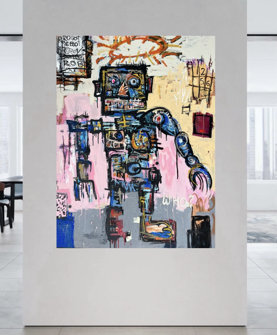 Grab a blender and add some pop art, expressionism, spray paint, ideas about robots and out of control Al taking over the world, and you will end up with an artwork that looks something like this, a Neo Pop statement piece and will give maximum impact to any room.