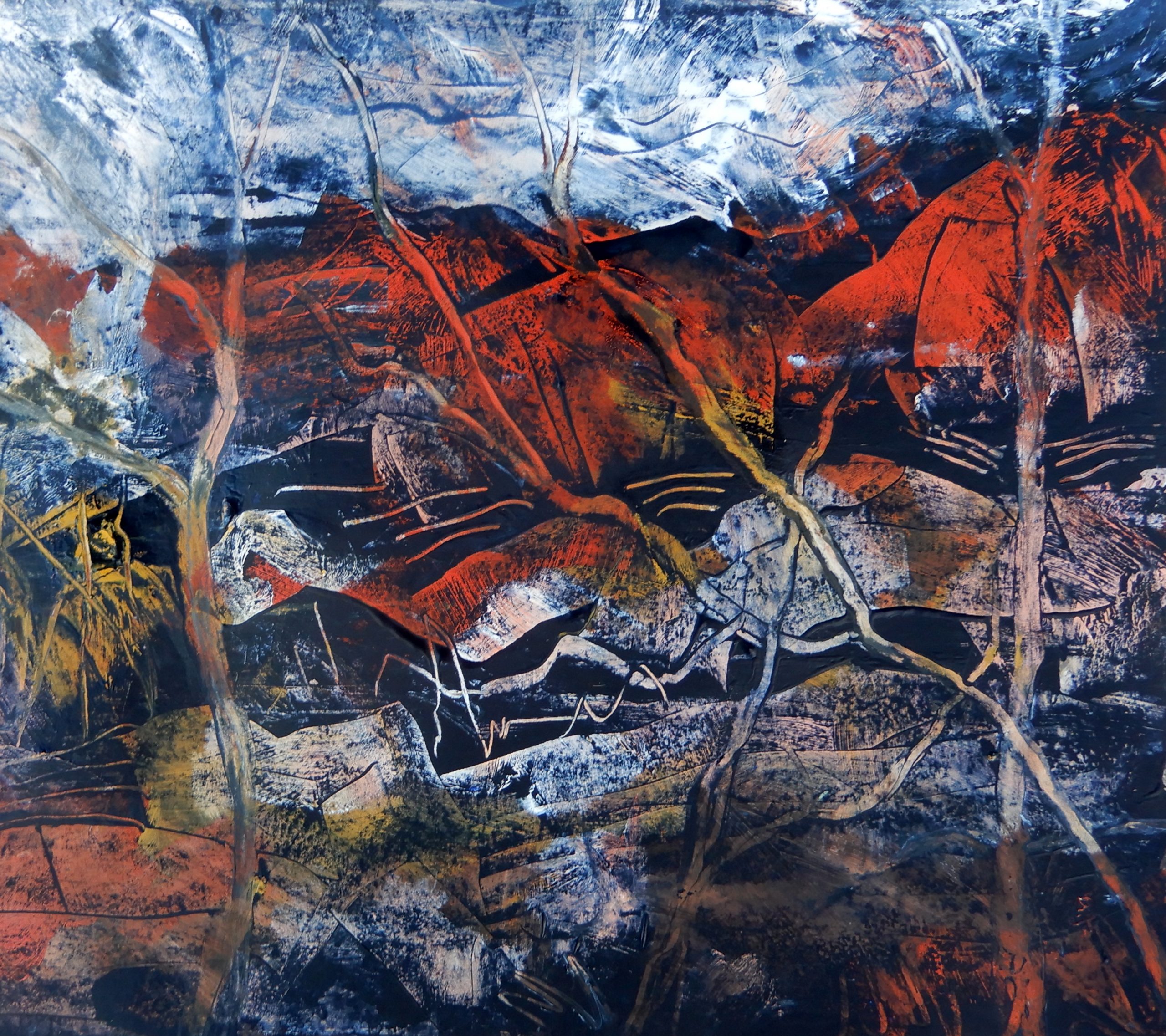 I’ve become intrigued by the technique of sgraffito, which is more usually applied in ceramics when various tools are used to score the clay. It’s fascinating to scrape through layers of paint, completely obscured by the final layer, and see what emerges as the composition is created. This is a dramatic piece, with all the chaos of the bush expressed in its gestural marks.