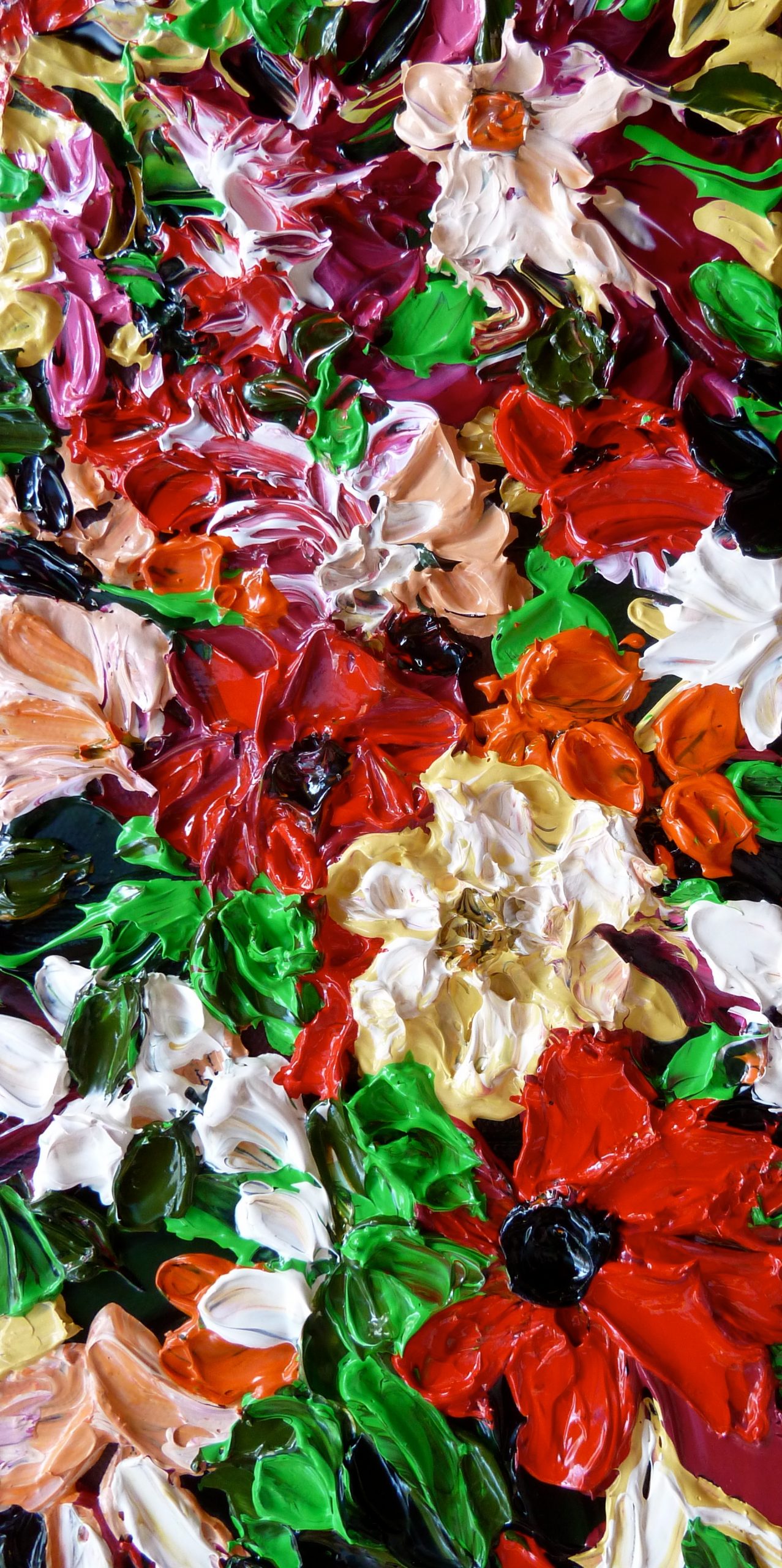 Wild Blooms by Cathy Gilday – These colourful blooms have been painted using a palette knife and heavily textured acrylic paint. This has given the piece both movement and a luscious buttery look. Sides painted and ready to hang.
